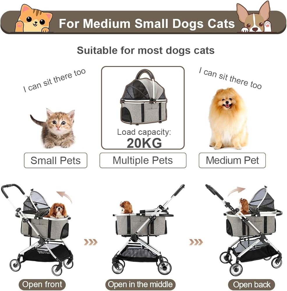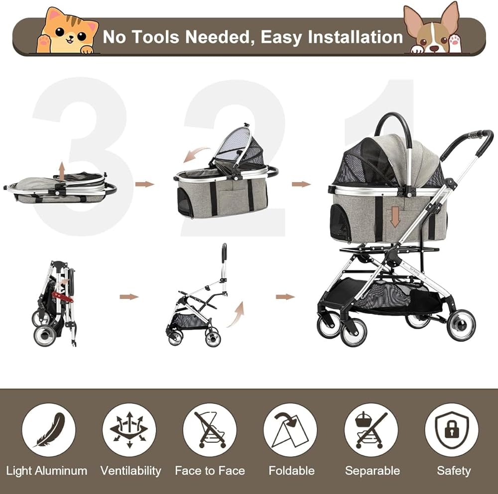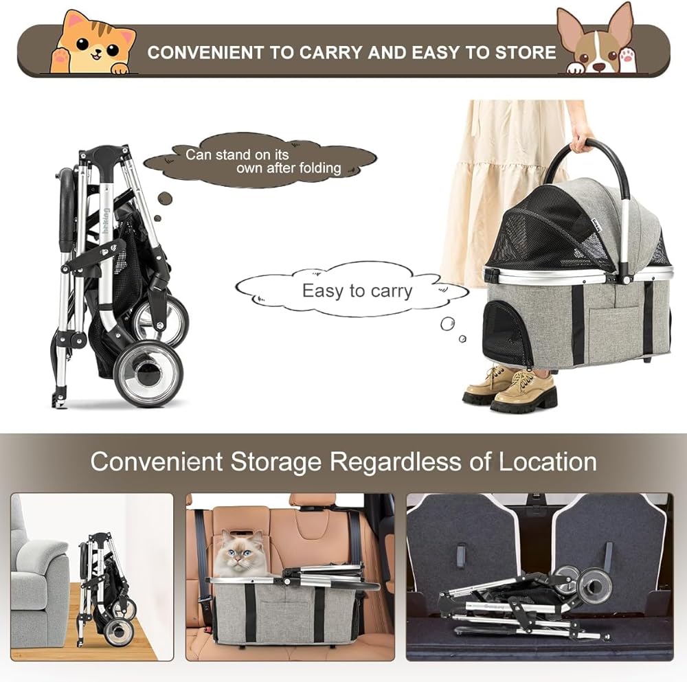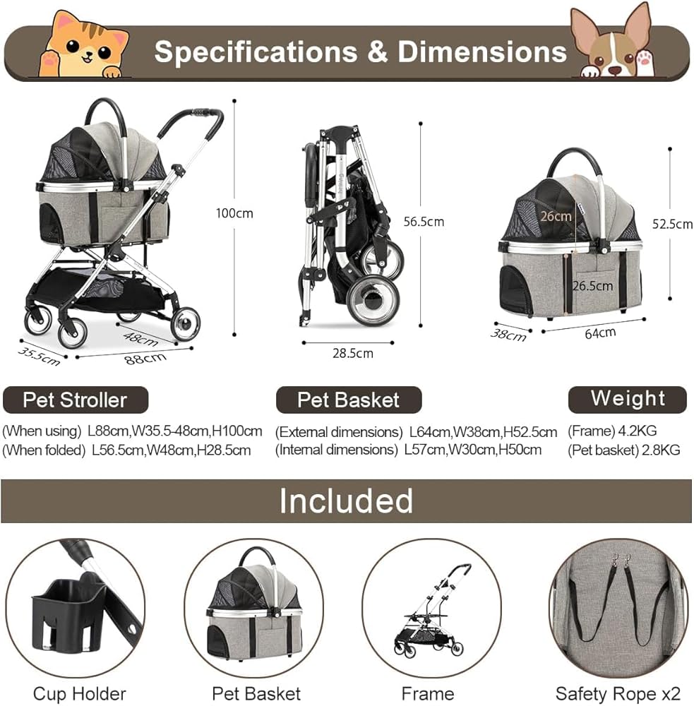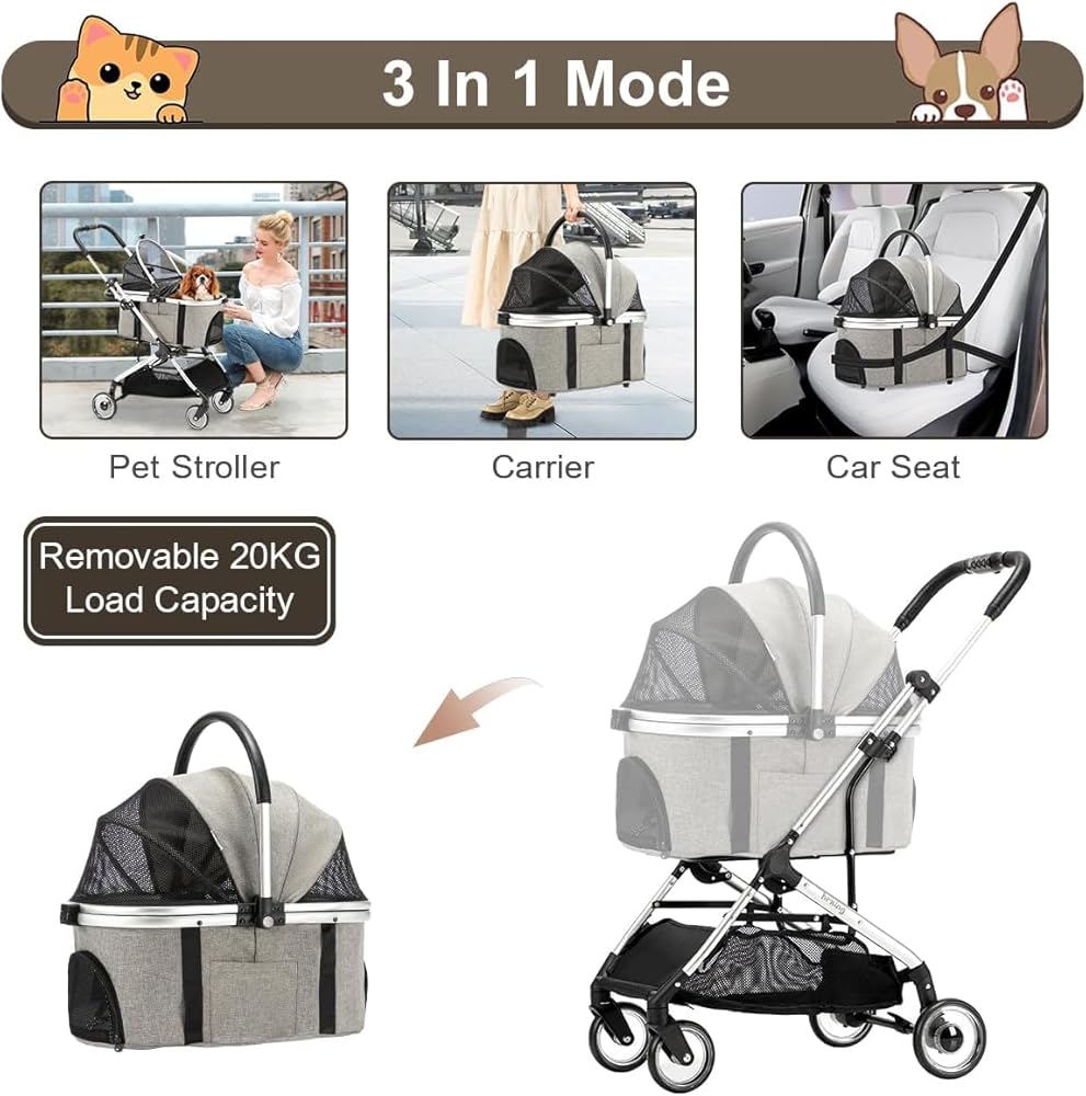 • 【3-in-1 Multifunction Pet Stroller】- This pet stroller offers the perfect blend of convenience and versatility with its innovative 3-in-1 design. Use it as a traditional stroller for easy and comfortable strolls, detach the carrier for a portable travel option, or convert it into a cozy pet crate when you're on the go.
