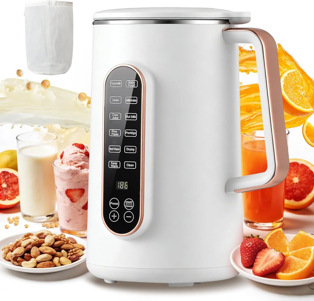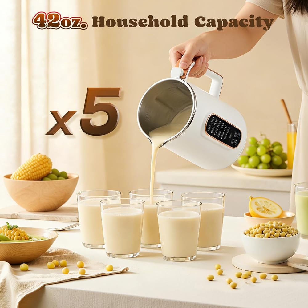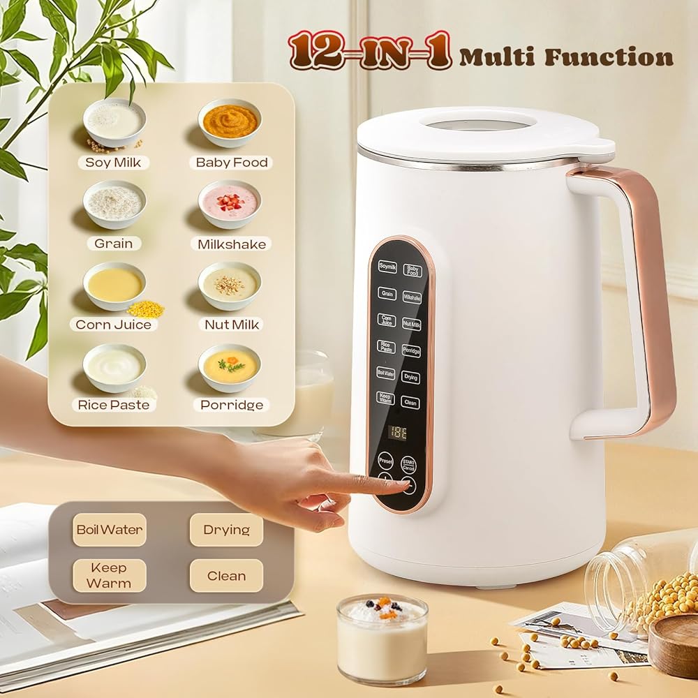 صانع حليب الصويا بسعة 40 أونصة من Moongiantgo، ماكينة صنع حليب اللوز الأوتوماتيكية 8-1، حليب نباتي، حليب الشوفان، مشروبات خالية من الألبان، ماكينة صنع حليب الجوز بـ 10 شفرات مع تأخير البدء/الحفاظ على الدفء/التنظيف التلقائي لمدة 12 ساعة، أبيض
