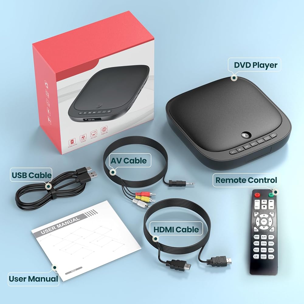 ما يتضمن: مشغل DVD، جهاز التحكم عن بعد، كابل AV، كابل HDMI، كابل USB، دليل المستخدم