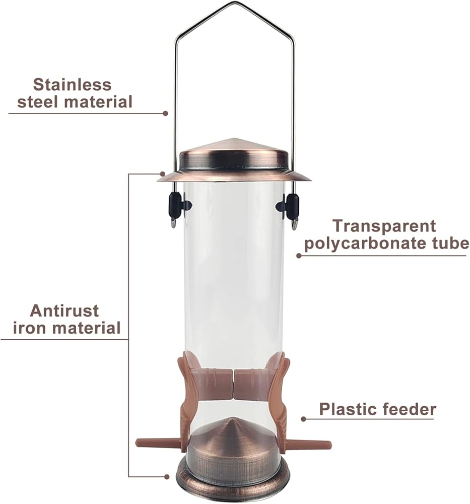مناسب لمعظم أنواع تغذية الطيور: يعتبر جهاز تغذية الطيور المقاوم للمطر أفضل جهاز تغذية للطيور بما في ذلك البذور المختلطة والفول السوداني. إن مغذيات الطيور الخارجية مناسبة لمعظم أنواع البذور، مثل بذور عباد الشمس والفول السوداني وحبات الذرة وديدان الوجبة. يجذب جهاز تغذية الطيور الخارجي نقار الخشب والعصفور والعصافير الحمراء والحسون. أضف الاهتمام والحيوية إلى حديقتك. مغذي العصافير هدية مثالية لمحبي الطيور