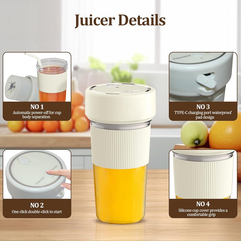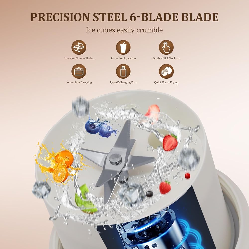 • 🍹【POWERFUL & EFFICIENT】The portable juicer blender is equipped with 6 PCS stainless steel blades, high speed DC motor, powerful, fast and delicate juicing, just 30 seconds to bring you a fresh smoothie, milkshake, freshly squeezed juice, etc., so that you can enjoy fresh juice easily.