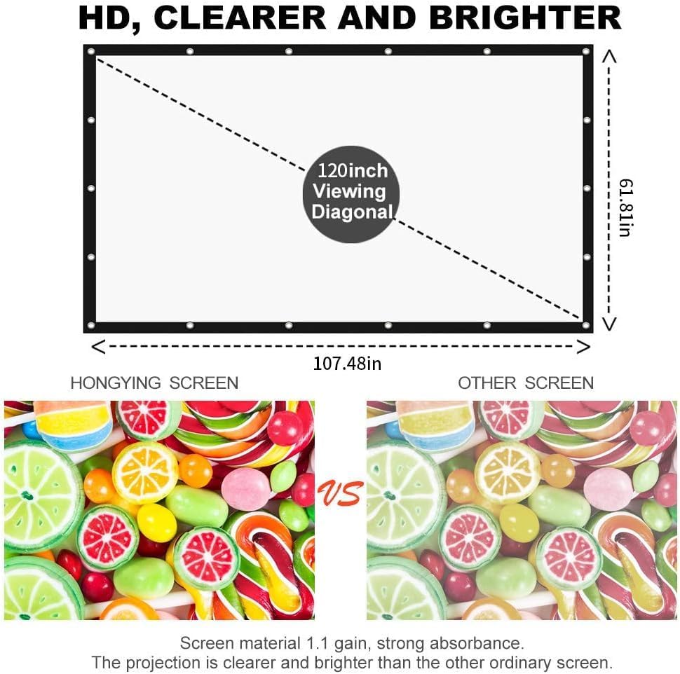 【Cinema Quality Visuals】120"16:9 large projection screen size allows you and your family to be immersed in the shocking picture at movie night, allowing you to enjoy the cinema big screen anytime, anywhere.