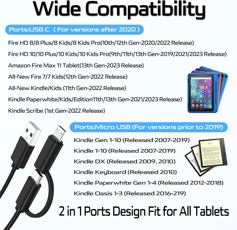 • You Can't Go Wrong: The charging cord with dual-head design (USB C & Micro USB) can be used for both new and old kindle versions. For example, it can be used for Amazon Fire HD 10/8/7/6/kids/kids pro, kindle paperwhite, fire max 11,kindle oasis/e-reader/voyage, TV stick/fire-stick, Samsung Galaxy Tab A A7 A8 A9 S2 E