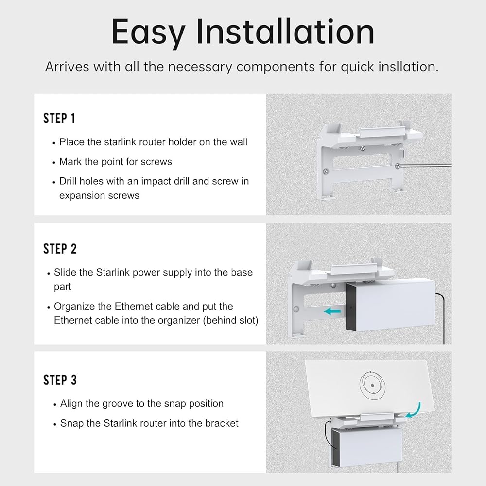 سهلة التركيب: تم تجهيز مجموعة توجيه الكابلات الداخلية من ستارلينك بمسامير التوسيع ومسامير التوسيع. الأدوات المطلوبة: مثقاب، قلم تحديد، مفك براغي متقاطع. يمكن تركيب حامل مودم ستارلينك وفقًا للتعليمات