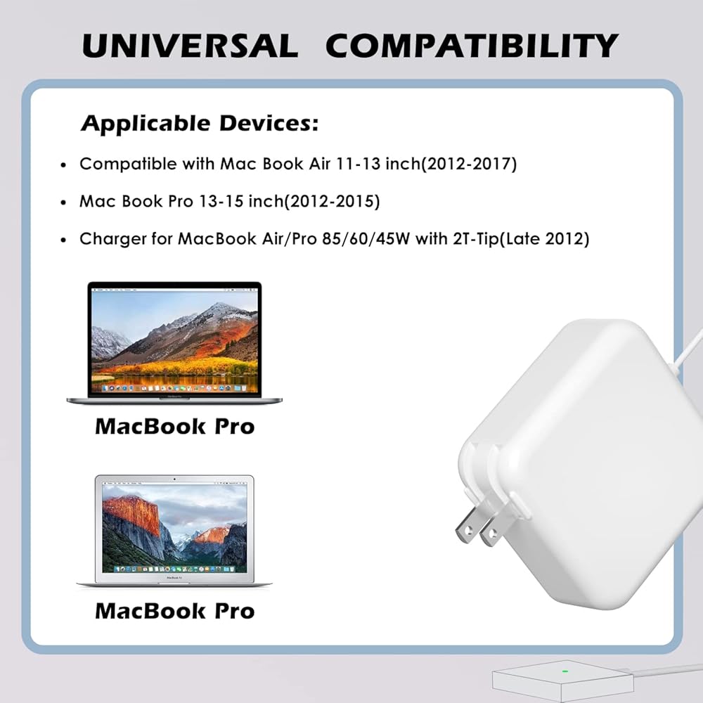 ▲النماذج المتوافقة: الإدخال: تيار متردد 100 - 240 فولت ~ 1.5 أمبير 50-60 هرتز، الإخراج: تيار مستمر 20 فولت - 4.25 أمبير 85 وات. متوافق تمامًا: مصمم ليتوافق مع جهاز Mac book Pro 13/15/17 بوصة وMac book Air 15/13 بوصة. شاحن Qiyezinuo mac متوافق مع موديلات ماك: A1398، A1424، A1425، A1435، A1465، A1466، A1502، MC975، MC976، MD506، ME293، ME294، ME664، ME665، MGXA2، MGXC2، MJLT2، MJLU2. موصل T-tip من الجيل الثاني، ينطبق فقط من 2012 إلى 2017
