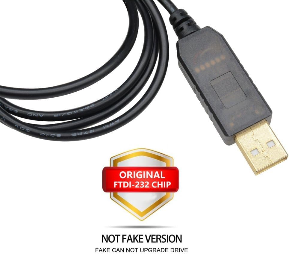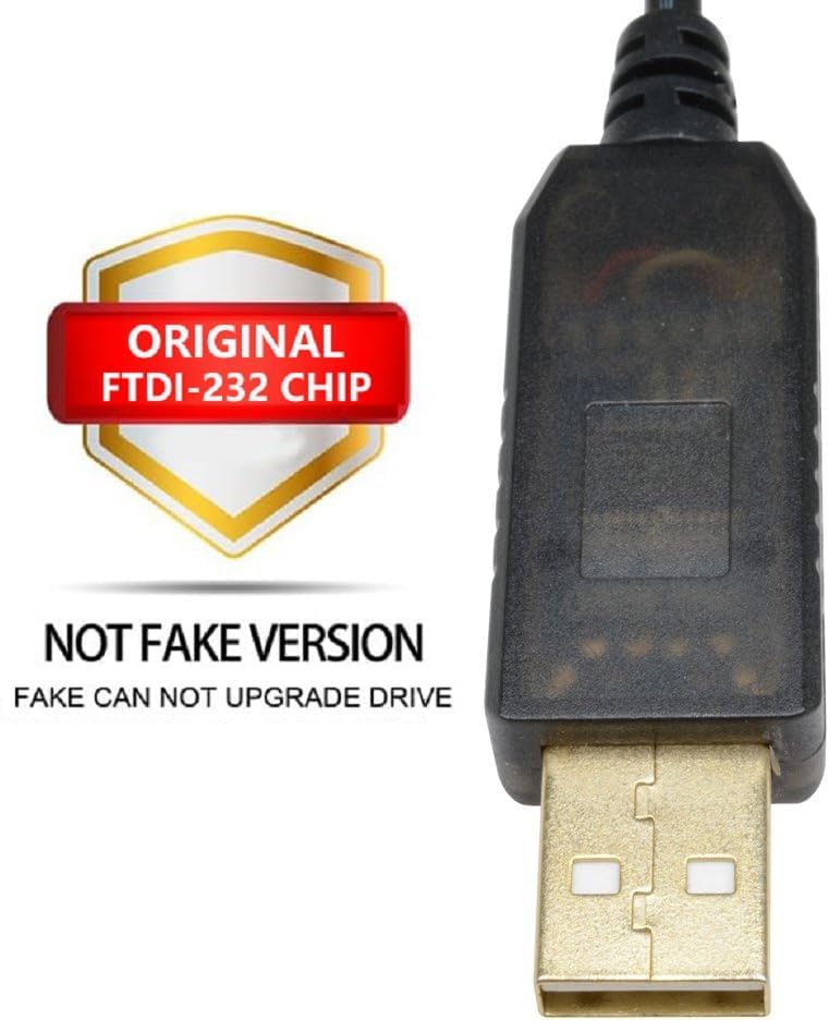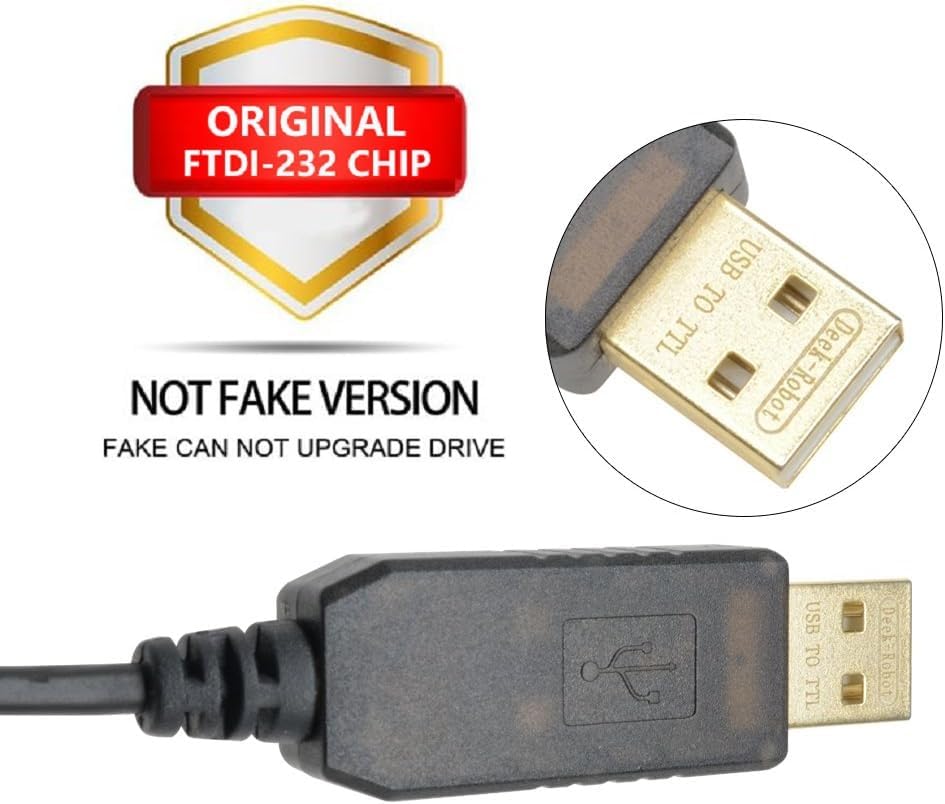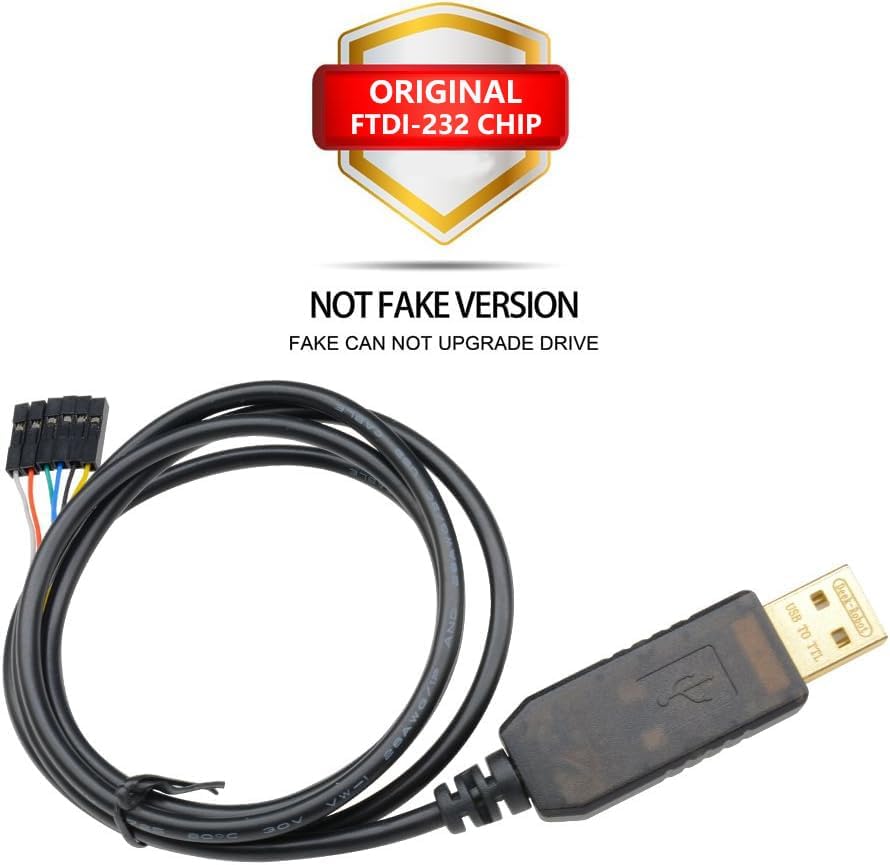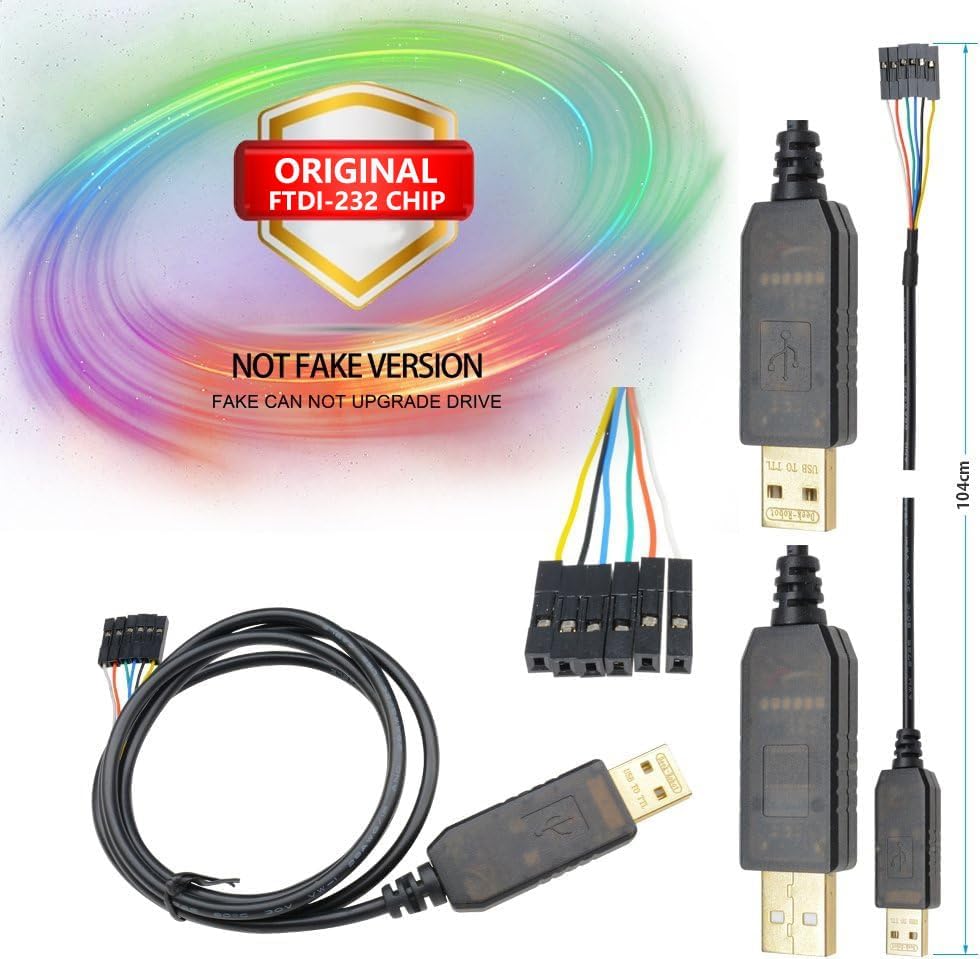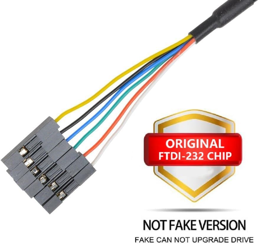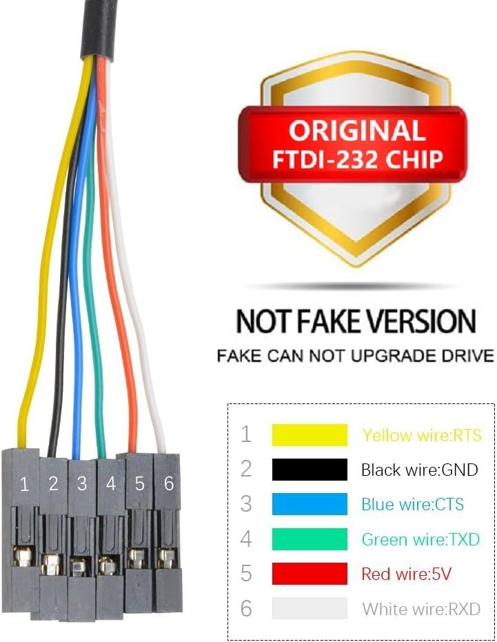 شريحة FTDI-232 الأصلية. وصف الدبابيس: أحمر -> 5 فولت؛ بلاك -> غند؛ وايت -> آر إكس دي؛ GRN -> TXD؛ بي إل -> سي تي إس؛ ييل -> آر تي إس