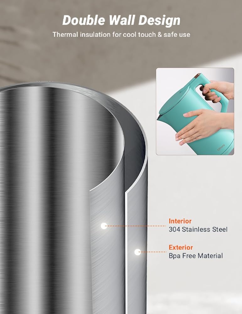 • Double Wall Design: The kettle shell is made of ABS material (BPA free) to avoid the risk of scalding the kettle with boiling water. Safer for the elderly and children. Keep your water warm for longer periods of time.