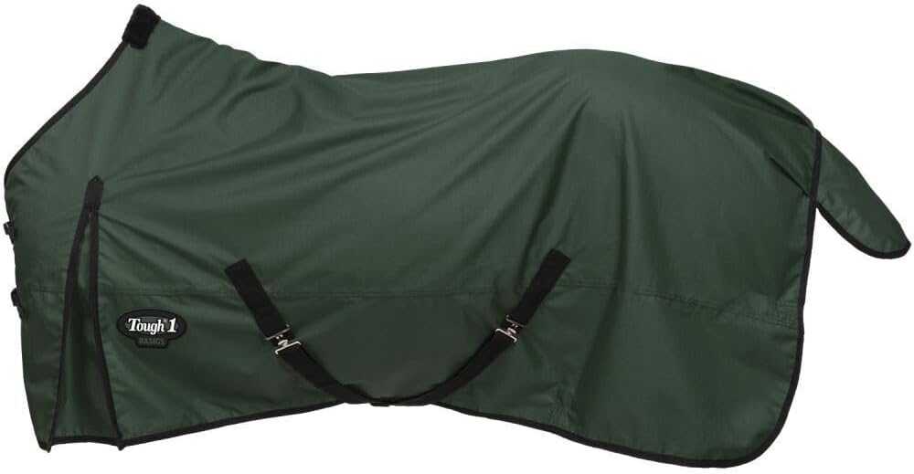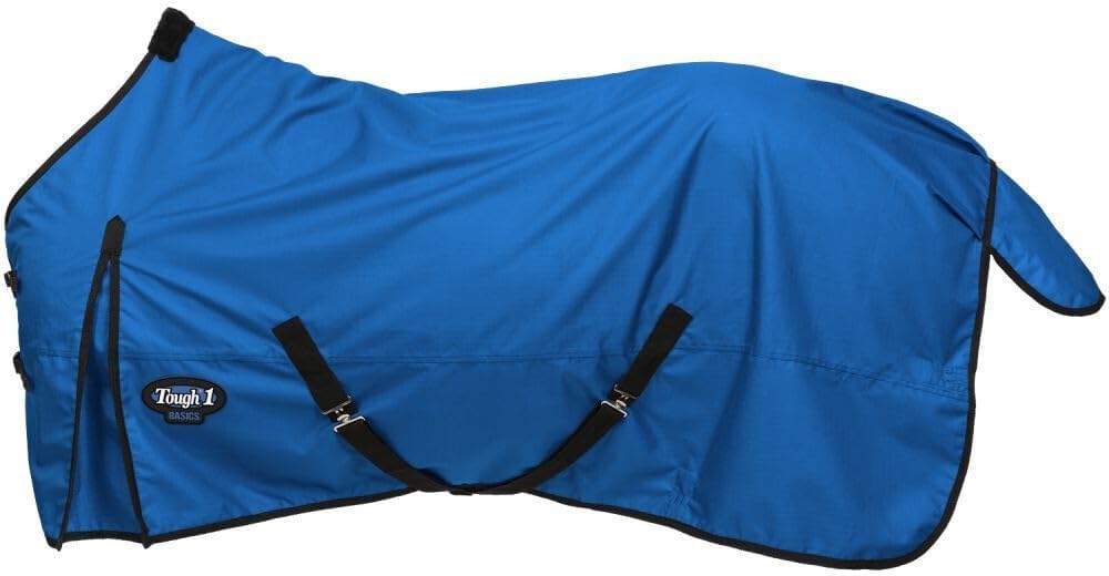 Basics By Tough1 1200 Denier Waterproof Poly Turnout Sheet Made of strong, durable 1200 Denier waterproof polyester nylon with a 210 Denier lining, this sheet is great for sudden rain showers at the show, camping, trail riding, or just out in the pasture. Shoulder gussets, adjustable and replaceable leg straps, a double buckle front closure, and cross belly surcingles help ensure a secure fit. A tail flap provides more coverage for the rump while helping reduce tail breakage. Features: Waterproof Double buckle front closures 210 Denier lining Shoulder gussets Two cross belly surcingles Adjustable, removable leg straps Large tail flap Item Specifications: Material: 1200 Denier nylon Weight: Light Fill: 0 gram (no fill) Measuring Instructions: Stand your horse as square as possible, and measure from the center of chest around side of the body to the point of the horse's rump just before the tail. If your horse ends up measuring between sizes, always round up to the next size to ensure full coverage.