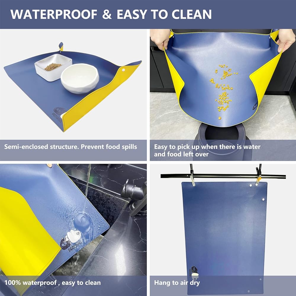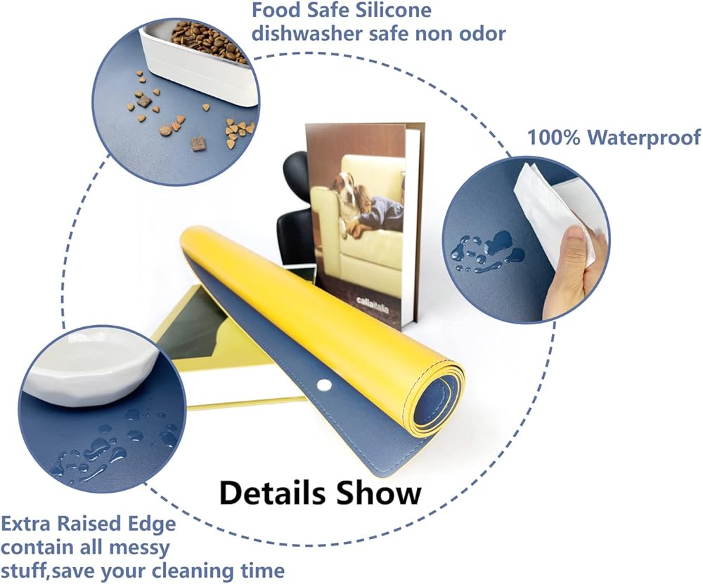 تصميم شبه مغلق: سجادة الكلب للطعام والماء فعالة في منع انسكاب الطعام والماء عن طريق الحفاظ على الطعام والماء على السجادة وبعيدًا عن الأرض. عندما يكون هناك ماء وبقايا طعام، يمكنك بسهولة التقاط السجادة وتنظيفها، مما يوفر وقت التنظيف.