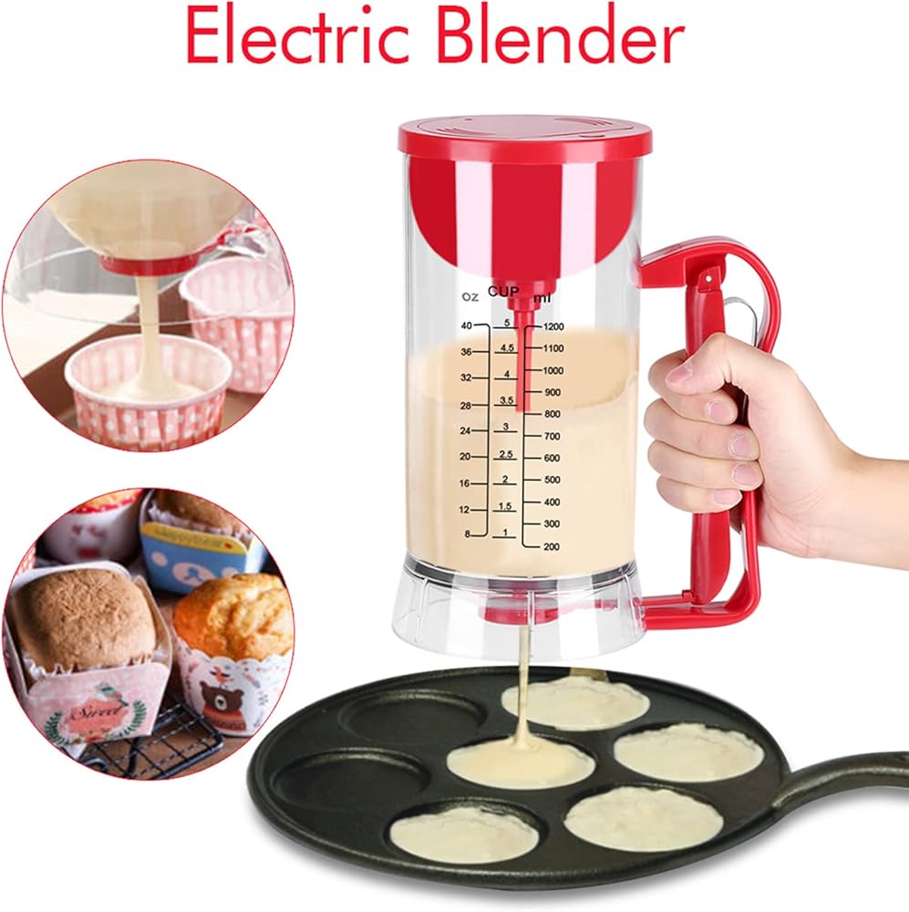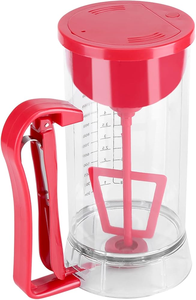 How To Use - Powered by batteries, press the red button at the top to start mixing automatically and press again to stop. Pull the handle to dispense quantitative batter to pancake machine or paper cup.