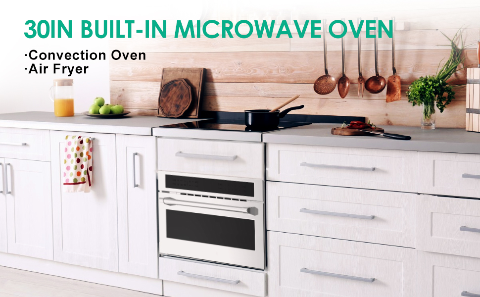 فرن ميكروويف حراري 30 بوصة، 1.6 قدم مكعب. قدم. فرن ميكروويف مدمج مع مقلاة هوائية، قفل أمان للأطفال، باب منسدل، تحكم باللمس، لحلول طهي متعددة الاستخدامات