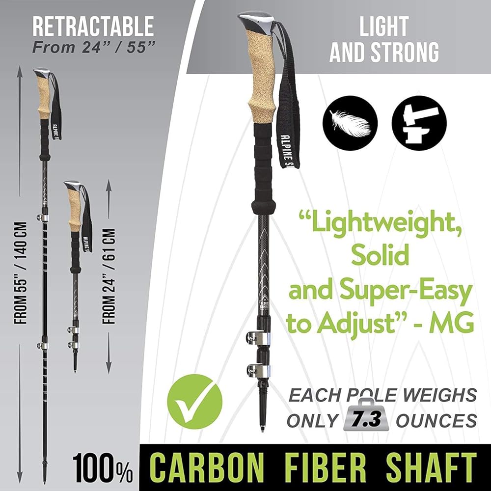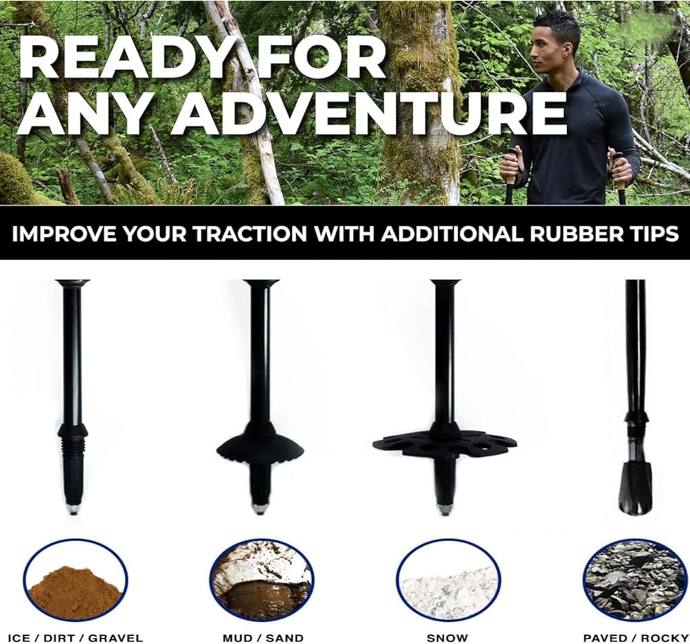【قابلة للتعديل وخفيفة الوزن】أقطاب المشي لمسافات طويلة المدمجة قابلة للتعديل من 24 إلى 55 بوصة وتزن 10 أونصات لكل عمود. أطراف كربيد قابلة للاستبدال للجر على الممرات الترابية وأغطية أطراف مطاطية معززة بالمعدن للممرات الصخرية.