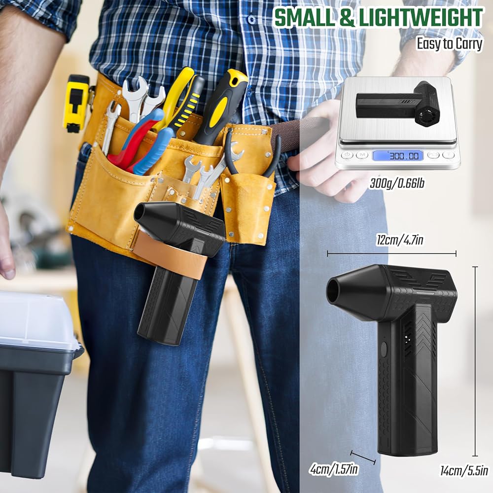 【منفضة هواء كهربائية بمروحة نفاثة】تتميز منفضة الهواء المضغوط هذه بمحرك عالي السرعة بدون فرشاة وتصميم نفاث صغير، 3 أوضاع للسرعة قابلة للتعديل وقوة الرياح تصل إلى 170 جرام، أداء قوي، يمكن أن يكون فعالاً، تنظيف عميق للوحات المفاتيح والسيارات. ومرشحات الهواء، ويتعامل بسهولة مع الأوراق المتساقطة والأمطار والثلوج. سهل الاستخدام، اضغط لفترة قصيرة على الزر للتنشيط، اضغط لفترة قصيرة على الزر بين 3 سرعات هواء مختلفة، اضغط لفترة طويلة للعمل ويتوقف عند تحريره.
