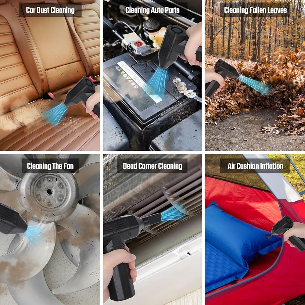 【استخدام متعدد الاستخدامات】تم تجهيز منفاخ الهواء اللاسلكي بـ 4 فوهات مغناطيسية مختلفة تلبي متطلبات التنظيف المختلفة. لا يُستخدم منفاخ الهواء الكهربائي المحمول الخاص بنا فقط لتنظيف الفتات والشعر والغبار من أجهزة الكمبيوتر الشخصية ولوحات المفاتيح والأرائك ومكيفات الهواء وشقوق مقاعد السيارة، بل يمكنه أيضًا إزالة الثلج وإشعال الحرائق ونفخ الأسرّة وحلقات السباحة وقوارب النجاة والمكنسة الكهربائية. حقيبة التخزين، الخ.