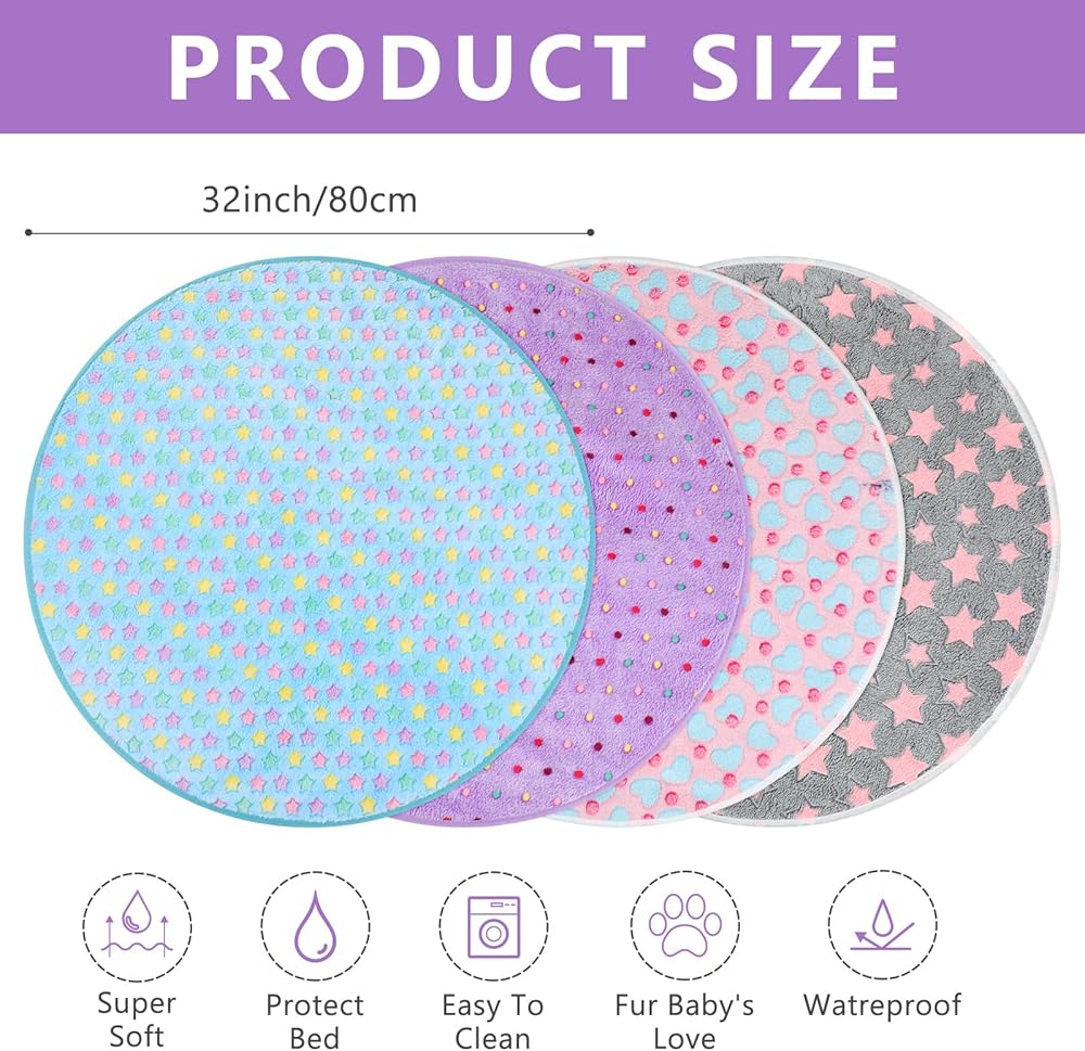 Features: Lightweight and portable: Owing to nice material, our puppy training pads are lightweight and easy to carry, will not bring much burden on you. Besides, they are also easy to store without occupying much space. Warm gift: These reusable pee pads for dogs round can be practical gifts for family, relatives, neighbors, mates and more, who own small pets, keeping home tidy and clean. Reusable pee pads for dogs round could be applied in dog kennel and dog crates for small dogs, training puppies to pee in pen or assisting incontinence elderly, as whelping pads, incontinence bed pads and waterproof floor mat for pets. Specifications: Quantity: 4 pcs Size: about 36 inches Color: as the picture shows Main material: fleece and waterproof membrane, coral velvet Package includes: 4 x Pee pads for dogs Warm notes: Please allow a little error on the size due to manual measurement. The color might have a slight difference due to different displays. Please read the size instruction carefully before purchasing. Before purchase, confirm whether the product size is suitable for your pet, and observe the pet's reaction when using. Please remove the product in time if there is any discomfort.