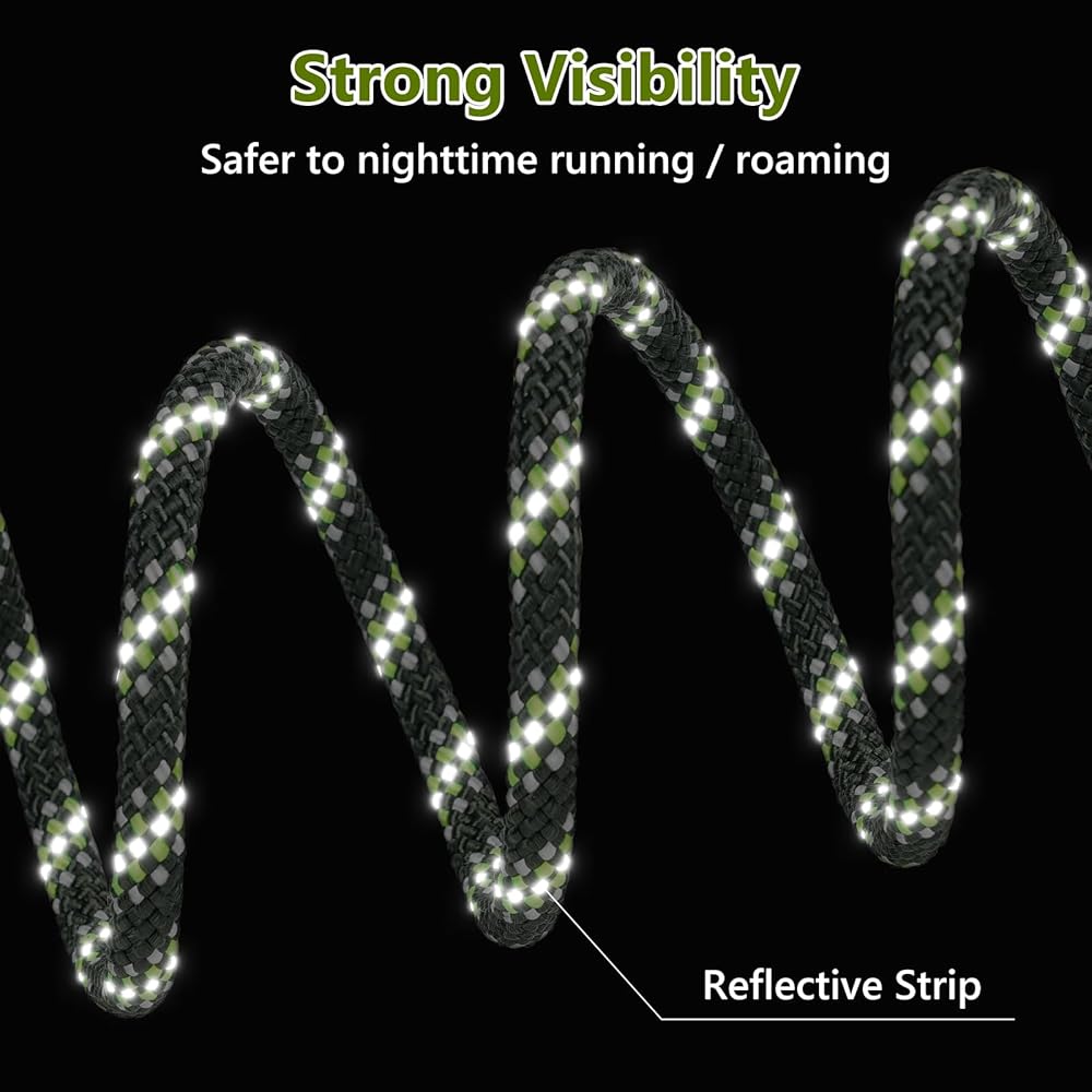 Safer yard leash: Compared to the steel core dog tie out cable, which is easy to curl, our dog run cable is made of 13 strands of polyester core rope and weaved with kernmantle technique, these improves the dog run line to be tangle-free and wear-resistant. Reflective points on the rope bring dogs safety at night.