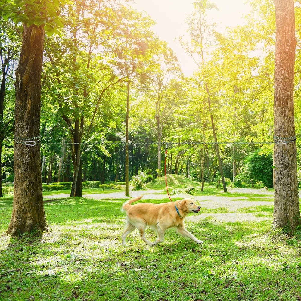 Easy to Install & Friendly to Trees: Unlike some aerial dog runner cable, which require fixed stakes to be driven into tree roots, Tresbro dog overhead cable is easier to set up and will not cause damage to trees. Just wrap the rope a few times and match it with 304 stainless steel buckles to secure the dog camping leash line to trees, pillars, or any other anchor post.