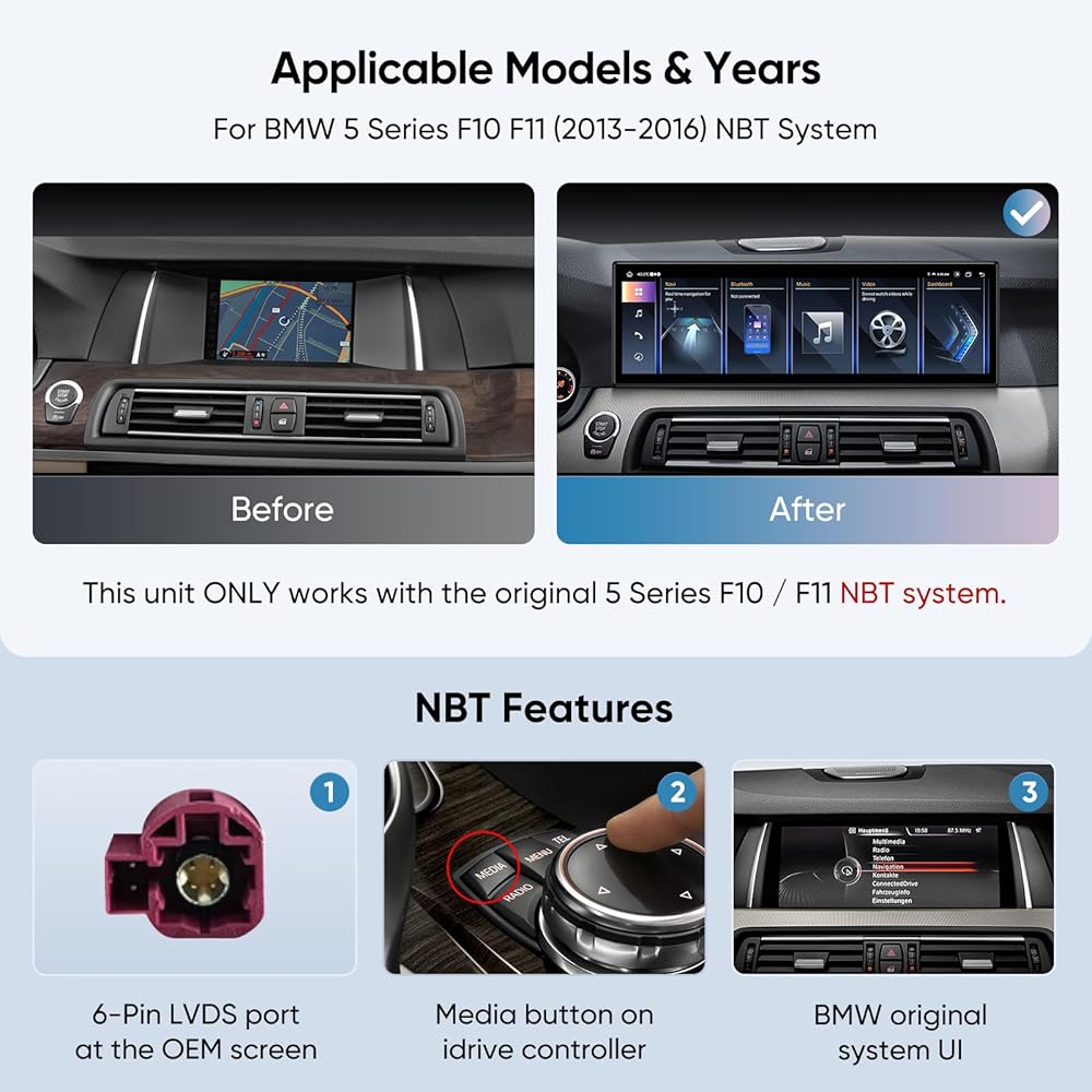 【الموديلات والسنوات المتوافقة】مصممة حصريًا لسيارة BMW 5 Series F10 F11 (2013-2016) مع نظام NBT-مركبات القيادة اليسرى. ملحوظة: هذا الطراز لا يناسب BMW F07.