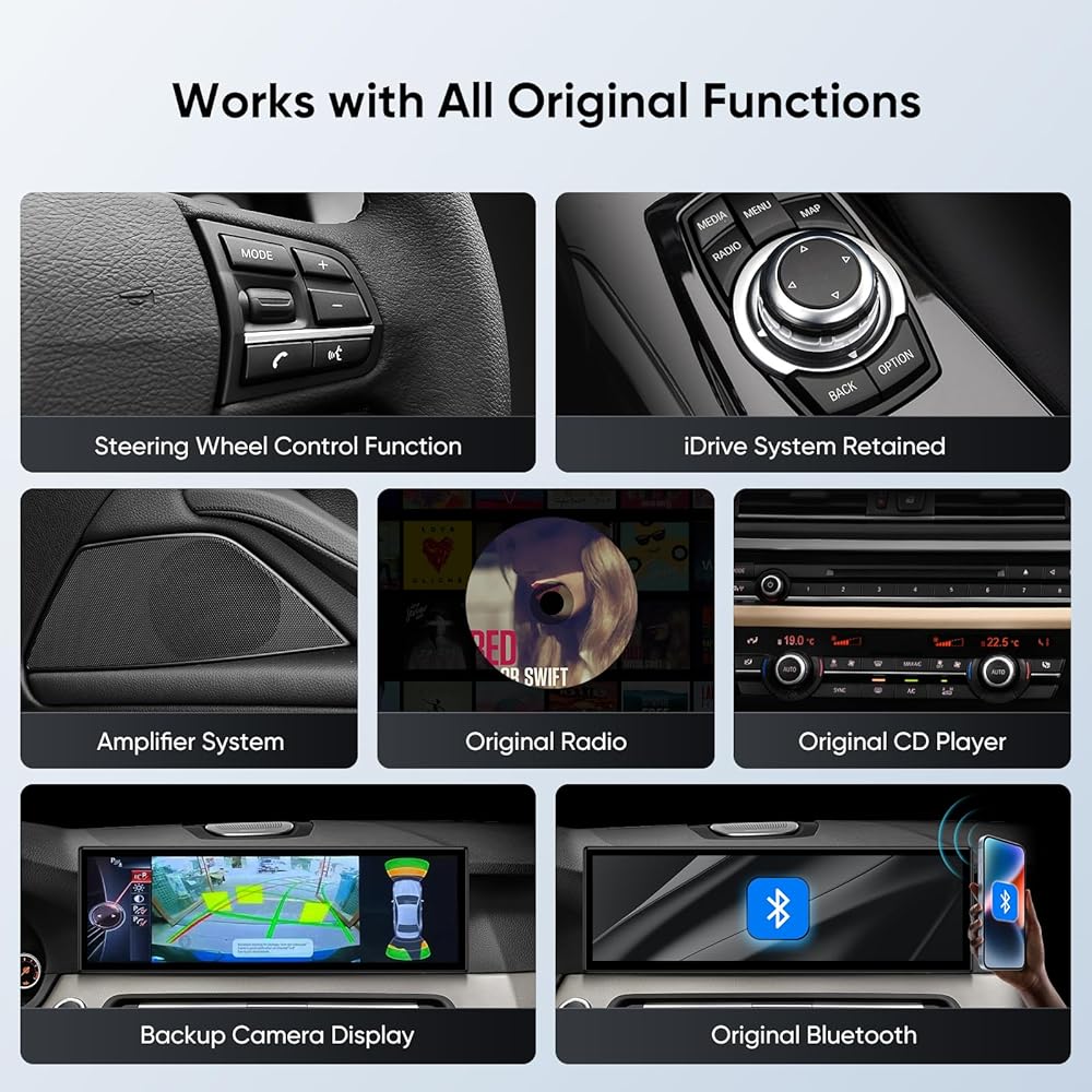 【تكامل مثالي】مصمم خصيصًا لسيارات BMW. لا تتطابق هذه الوحدات مع لوحة القيادة الأصلية للحصول على مظهر متكامل تمامًا فحسب، بل توفر أقوى تجربة لاسلكية CarPlay / Android Auto وشاشة تعمل باللمس لسيارتك BMW، مما يجعل لوحة القيادة أكثر ذكاءً من أي وقت مضى.