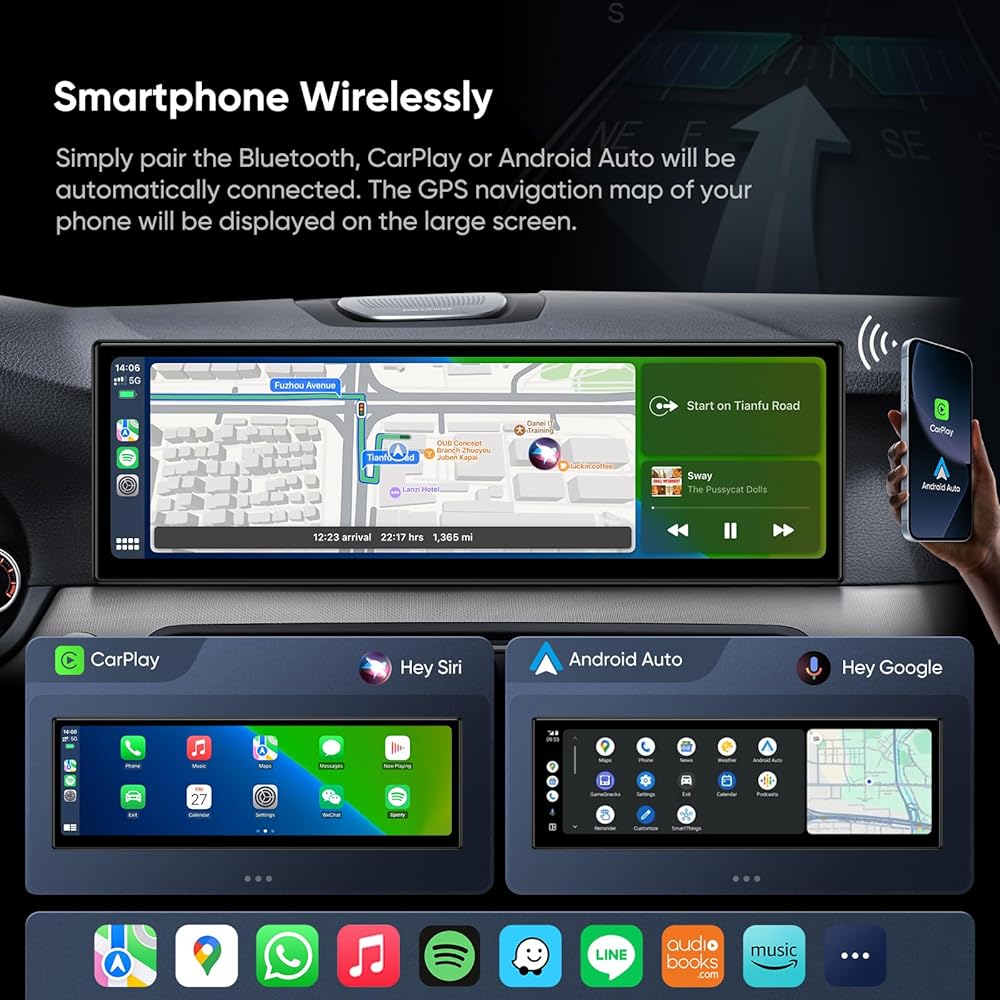 【تشغيل السيارة لاسلكيًا/سلكيًا وAndroid Auto】 استخدم هاتفك بأمان أثناء القيادة. بمجرد قول "Hey Siri" أو "OK Google"، للحصول على الاتجاهات وإجراء المكالمات وإرسال واستقبال الرسائل والاستمتاع بالموسيقى المفضلة لديك. يمكنك الوصول إلى الأوامر الصوتية، حيث يمكن لـ Siri وGoogle Assistant مساعدتك في القيام بكل هذه الأشياء. ملاحظة: قد لا تتمكن بعض الهواتف الذكية من الاتصال بنظام Android Auto اللاسلكي.