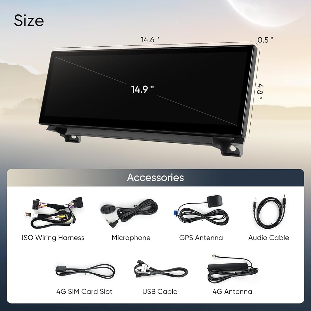 【الاحتفاظ بالوظائف الأصلية】الآن استبدل شاشة سيارتك، وقم بتوصيلها بمحول مجموعة الأسلاك. لديك شاشة لمس عالية الدقة مقاس 14.9 بوصة لتشغيل رابط الهاتف الذكي. تعمل مع جميع الوظائف الأصلية: نظام iDrive، نظام صوت الألياف البصرية الأصلي، الراديو الأصلي، مشغل الأقراص المضغوطة، بلوتوث، شاشة عرض الكاميرا الاحتياطية، وظيفة SWC إلخ.