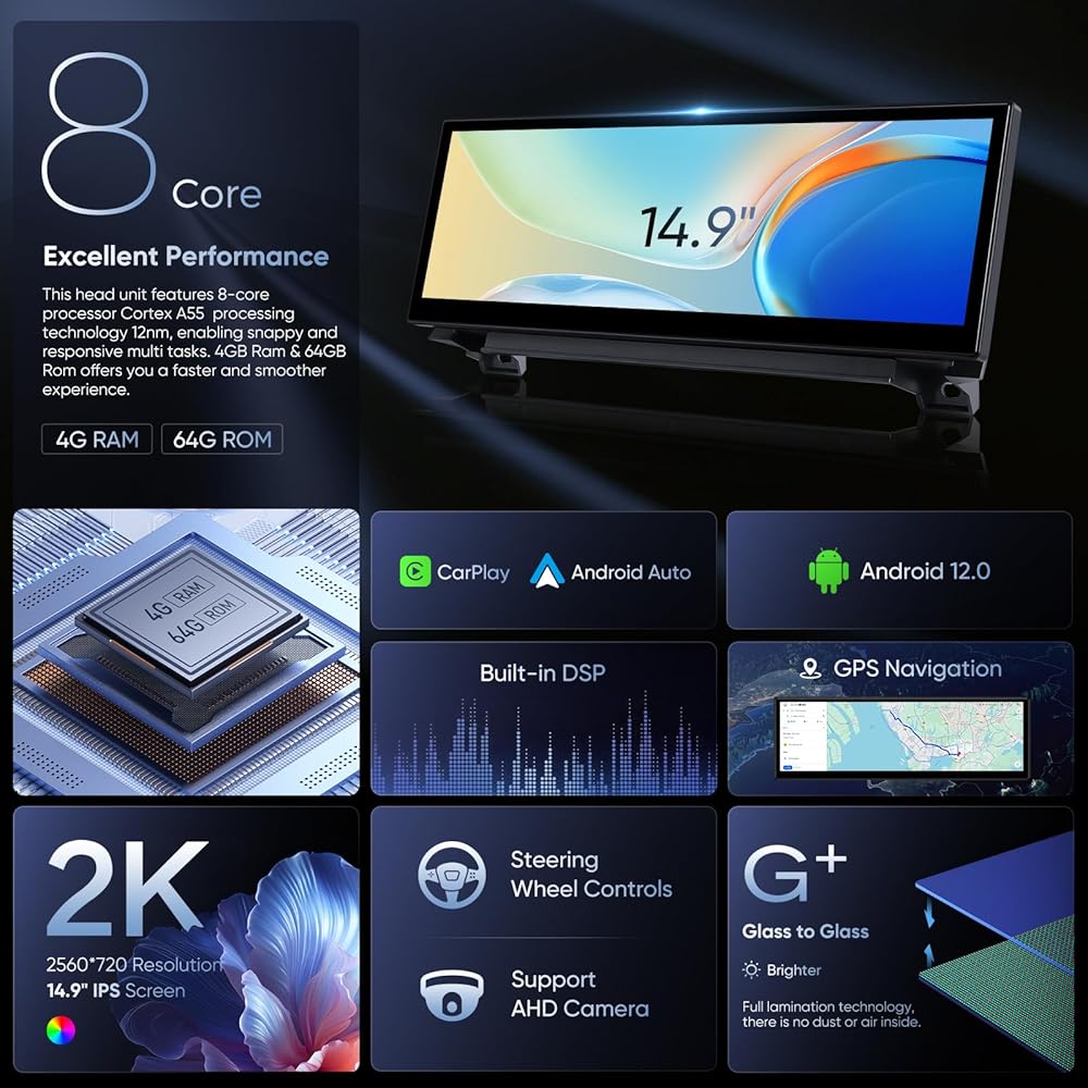 【شاشة تعمل باللمس مقاس 14.9 بوصة】 مع شاشة IPS تعمل باللمس، ودقة 2560 × 720 بكسل مقاس 14.9 بوصة، وجودة صورة عالية الدقة. توفر شاشة HD وضوحًا وتباينًا وسطوعًا رائعًا. التقط كل صورة حادة وحيوية ونابضة بالحياة من تقريبا أي وجهة نظر.