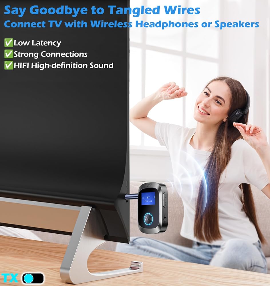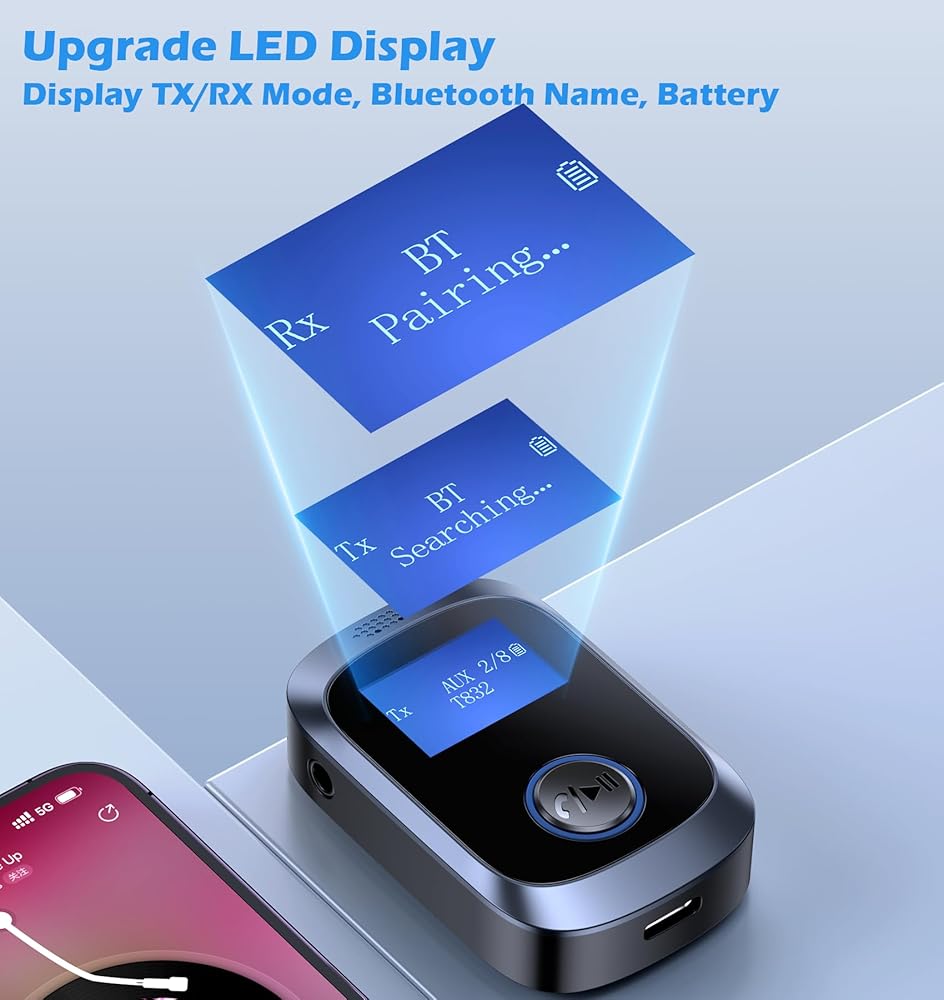 شاشة عرض عالية الدقة: استمتع بالتشغيل السلس مع شاشة العرض الواضحة لمحول سماعة الرأس هذه. عرض الوضع الحالي ومستوى البطارية واسم البلوتوث المتصل حاليًا، تساعدك هذه الميزة على تتبع حالة المحول بسهولة، وتحديد أي مشكلات بسرعة، وتجنب الاتصالات غير الصحيحة.