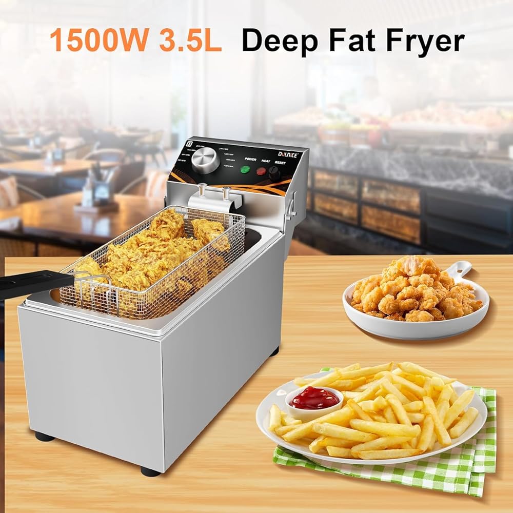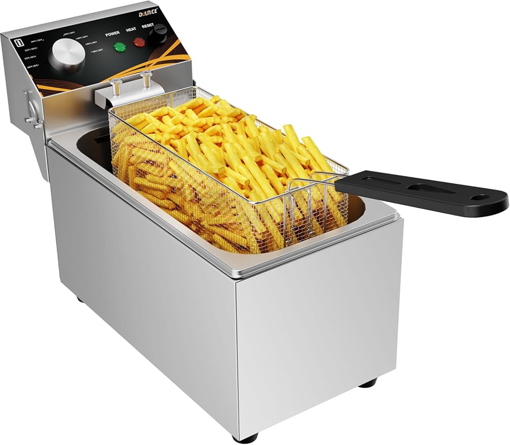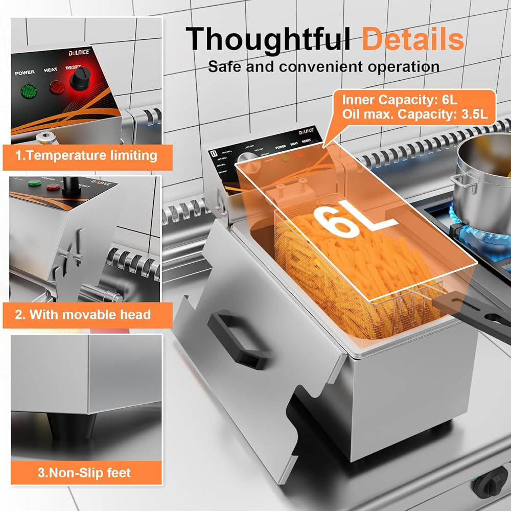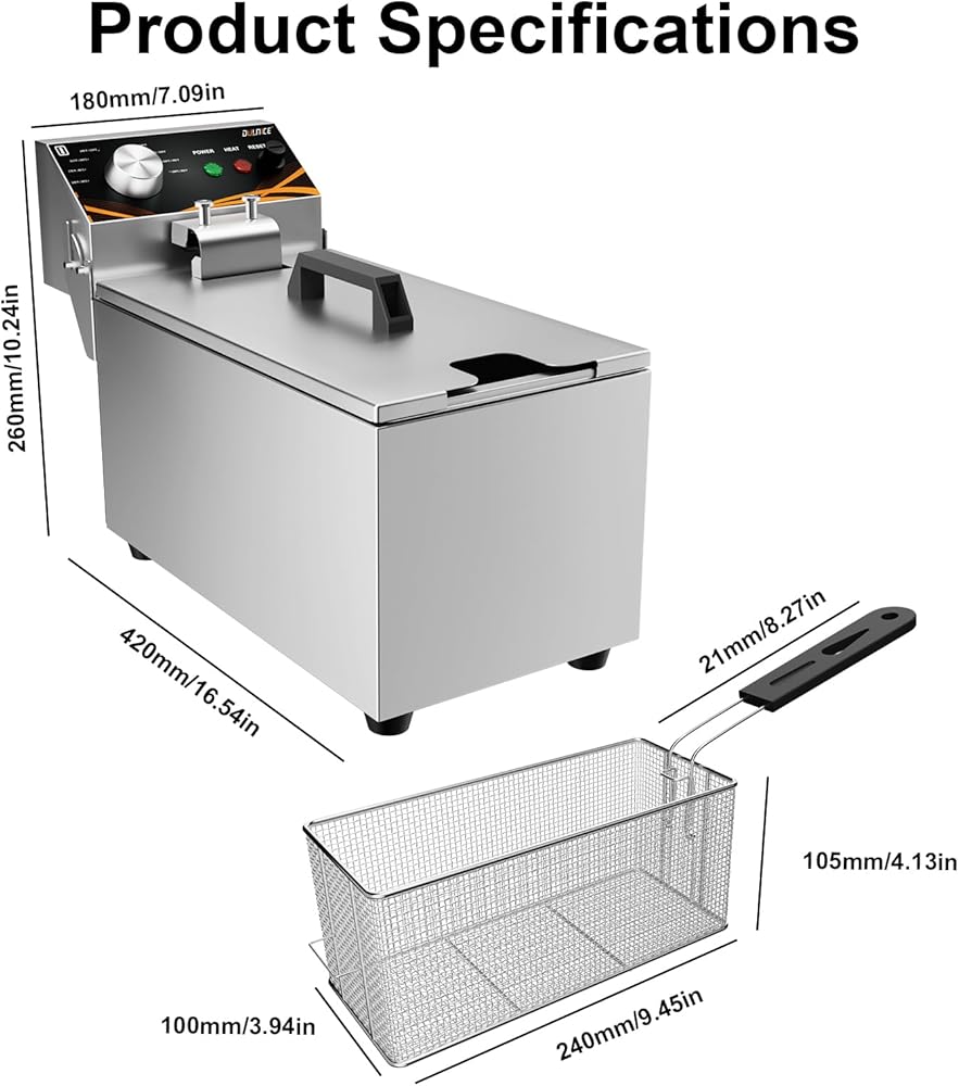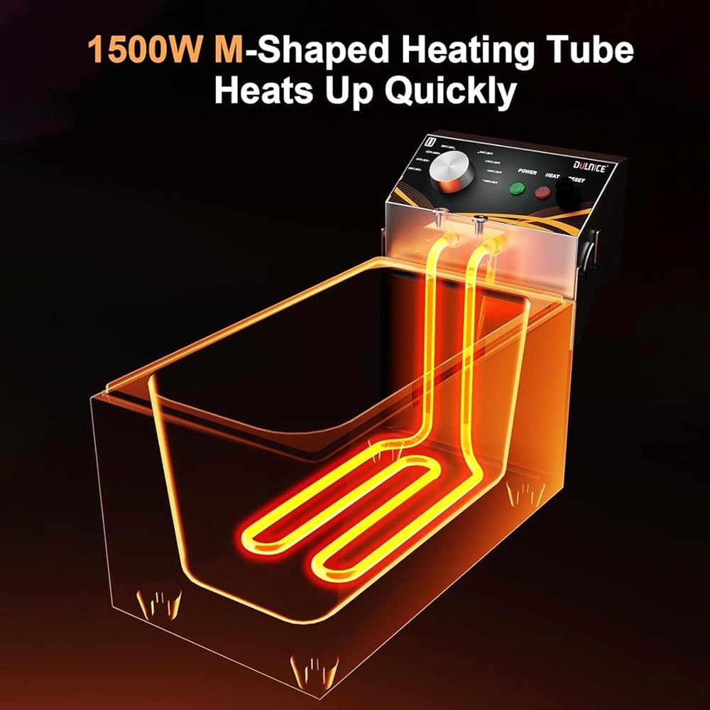 • Stylish Appearance:The DULNICE electric deep fryer is made of stainless steel with screw assembly, providing a stable, safe, and durable structure. With 1500W power, a metal knob, and a beautiful shape, it adds elegance to any kitchen or commercial space.