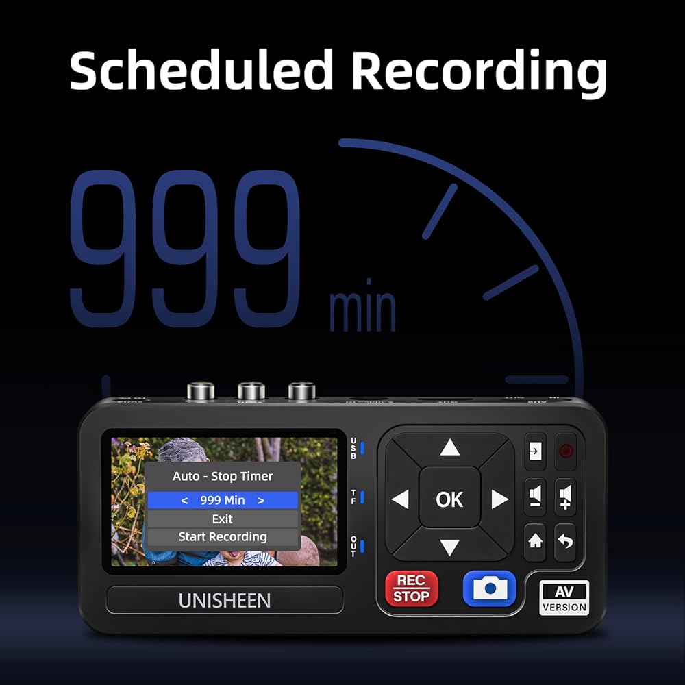 إيقاف التسجيل التلقائي - قم بتبسيط إدارة التسجيل الخاصة بك باستخدام مشغل VHS الخاص بنا إلى ميزة التسجيل التلقائي الذكي للمحول الرقمي. قم بضبط أوقات التسجيل مسبقًا بسهولة لضمان الدقة والكفاءة في مهام التحويل الخاصة بك.