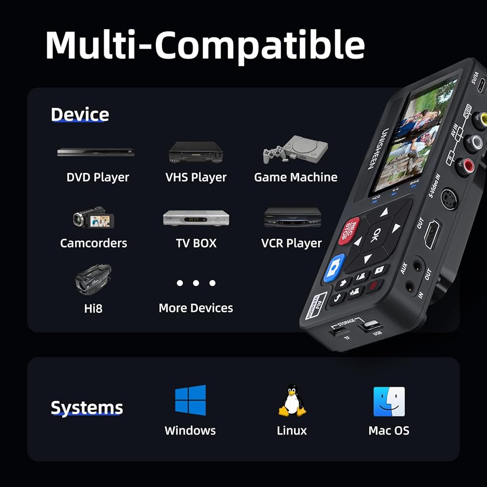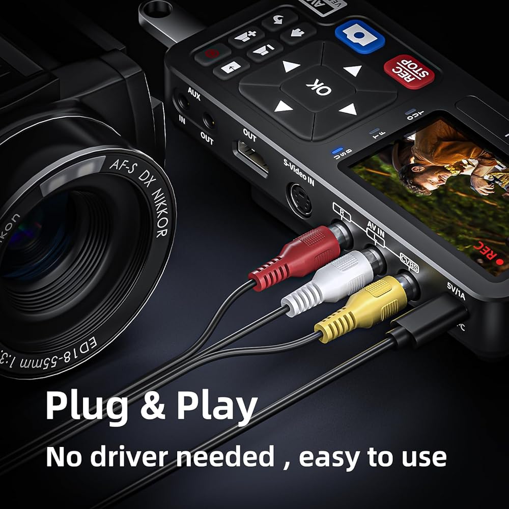 تحويل الفيديو عالي الوضوح - استمتع بتحويل الفيديو والصوت فائق الوضوح بلمسة واحدة 1080P 30 هرتز مع محول VHS الخاص بنا إلى رقمي. حافظ على الوضوح واللون الأصليين لذكرياتك الثمينة بدقة تبلغ 1920 × 1080. يدعم العديد من المدخلات مثل CVBS(AV)، وS-Video، وAUX للحصول على تجربة تحويل بدون استخدام الكمبيوتر الشخصي.