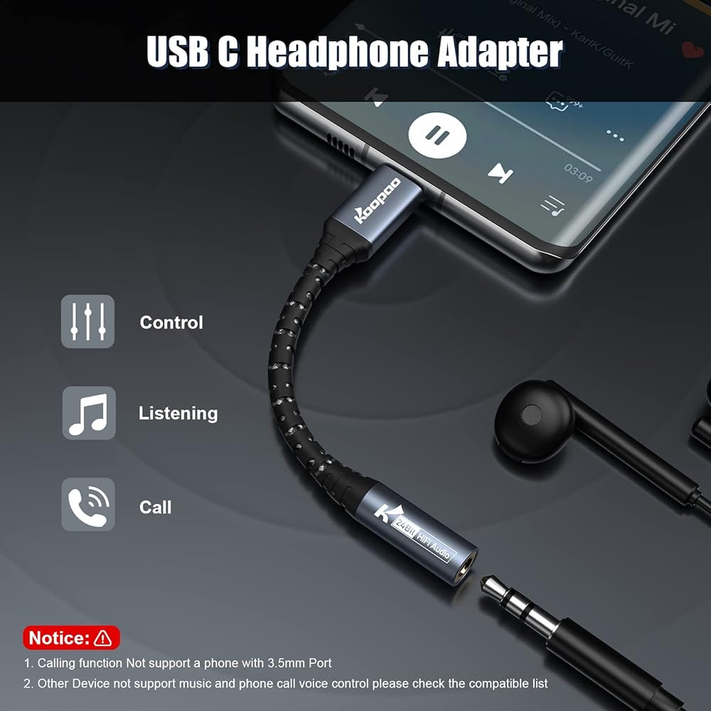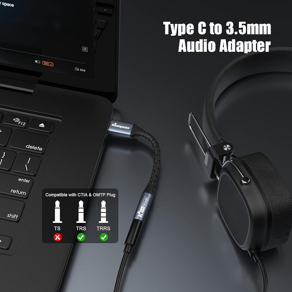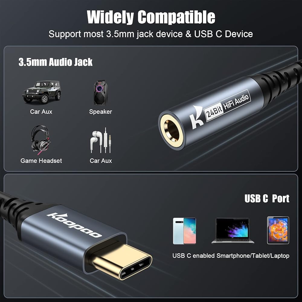 التوصيل للتشغيل: محول سماعة الرأس KOOPAO usb c يربط جهاز من النوع c بسماعة رأس 3.5 مم. شريحة أخذ عينات DAC مدمجة 32 بت 384 كيلو هرتز توفر محول USB c إلى aux جودة صوت أكثر استقرارًا وجيدة. يمكن توصيل منفذ usb c بجهاز usb c مثل الهاتف الذكي وipad وusb c كمبيوتر محمول؛ مقبس سماعة رأس 3.5 ملم يعمل مع سماعة رأس 3.5 ملم، وسماعة ألعاب 3.5 ملم، ومكبرات صوت مع صوت 3.5 ملم جاك. إنه سهل الاستخدام، فقط قم بالتوصيل والتشغيل، لا حاجة إلى برنامج تشغيل.