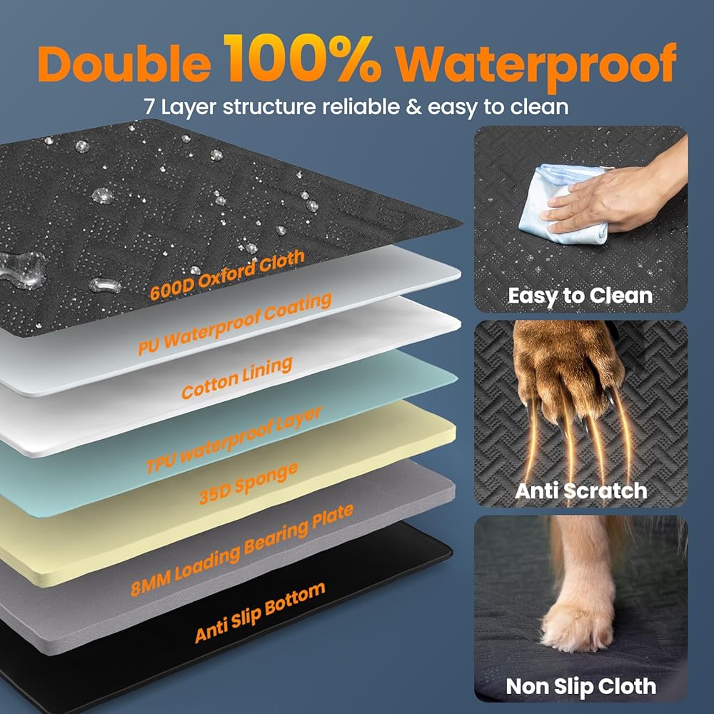 مقاومة للماء بنسبة 100%، مادة قوية، غير قابلة للانزلاق: موسع المقعد الخلفي للكلاب من Oneisall مع هيكل من 7 طبقات، كثافة السطح 4x4 من قماش أكسفورد 600D مما يجعل غطاء مقعد السيارة للكلب أكثر متانة وسهل التنظيف. الجزء السفلي الصلب مغطى بطبقة من الإسفنج 35D لزيادة راحة الكلاب أثناء الرحلة. تضمن الطبقة المزدوجة المقاومة للماء من البولي يوريثان والبولي يوريثان عدم تسرب السائل إلى مقعد سيارتك. والجزء السفلي به نقاط مطاطية مضادة للانزلاق تزيد من الاحتكاك لمنع كلبك من الانزلاق أثناء القيادة