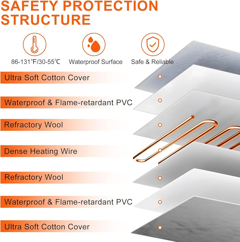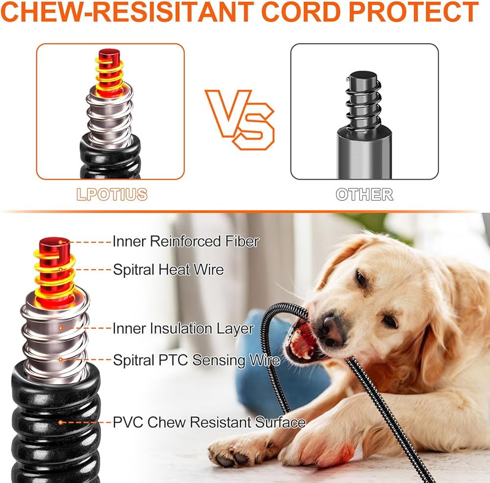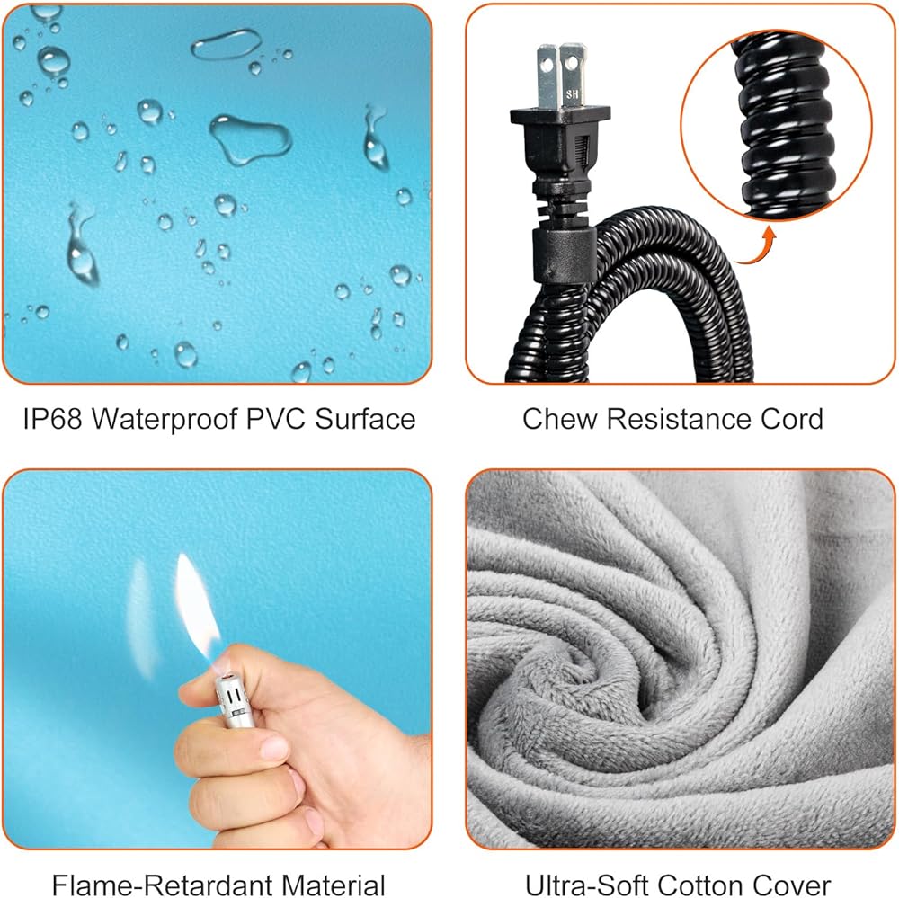 【Safety First Design】- Crafted from high quality heating wires, flame-retardant and scratch-resistant fabric, equipped with additional chew-resistant cord and built-in overheating auto-shutdown protection, our heating pad is designed to withstand your pet's everyday activities while keeping them protected.