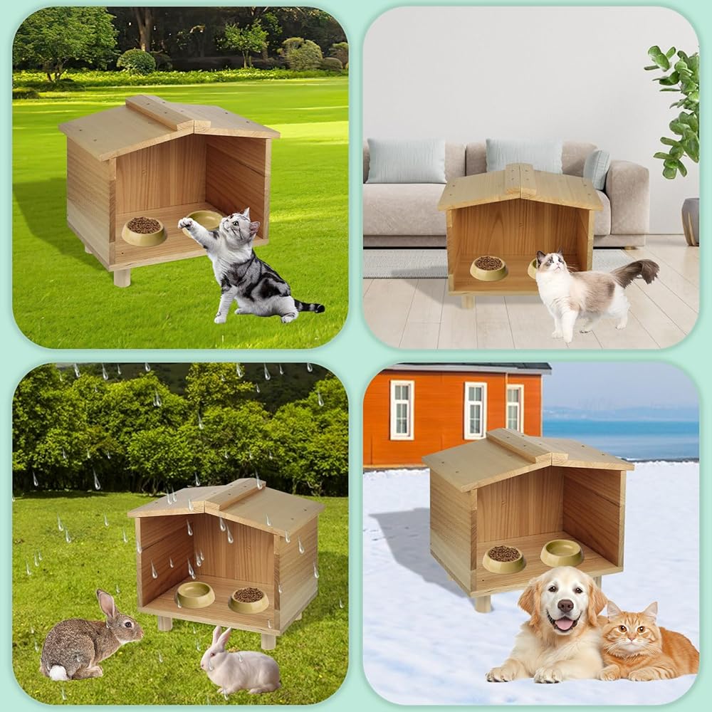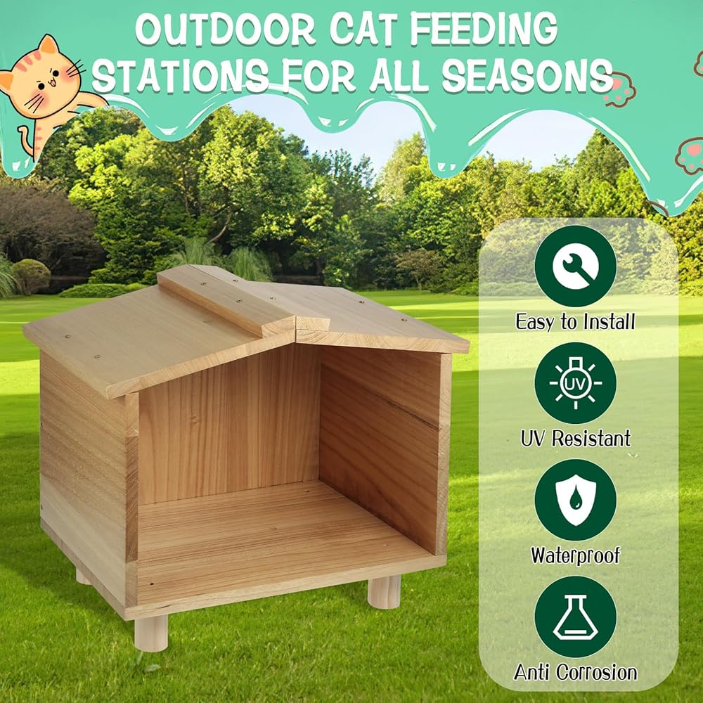 محطة تغذية القطط في الهواء الطلق، منزل خشبي مقاوم للماء للقطط في الهواء الطلق، وحدة تغذية القطط في الهواء الطلق، مأوى للقطط في الهواء الطلق للطعام والماء، غرفة طعام القطط في الهواء الطلق للقطط والكلاب والسناجب