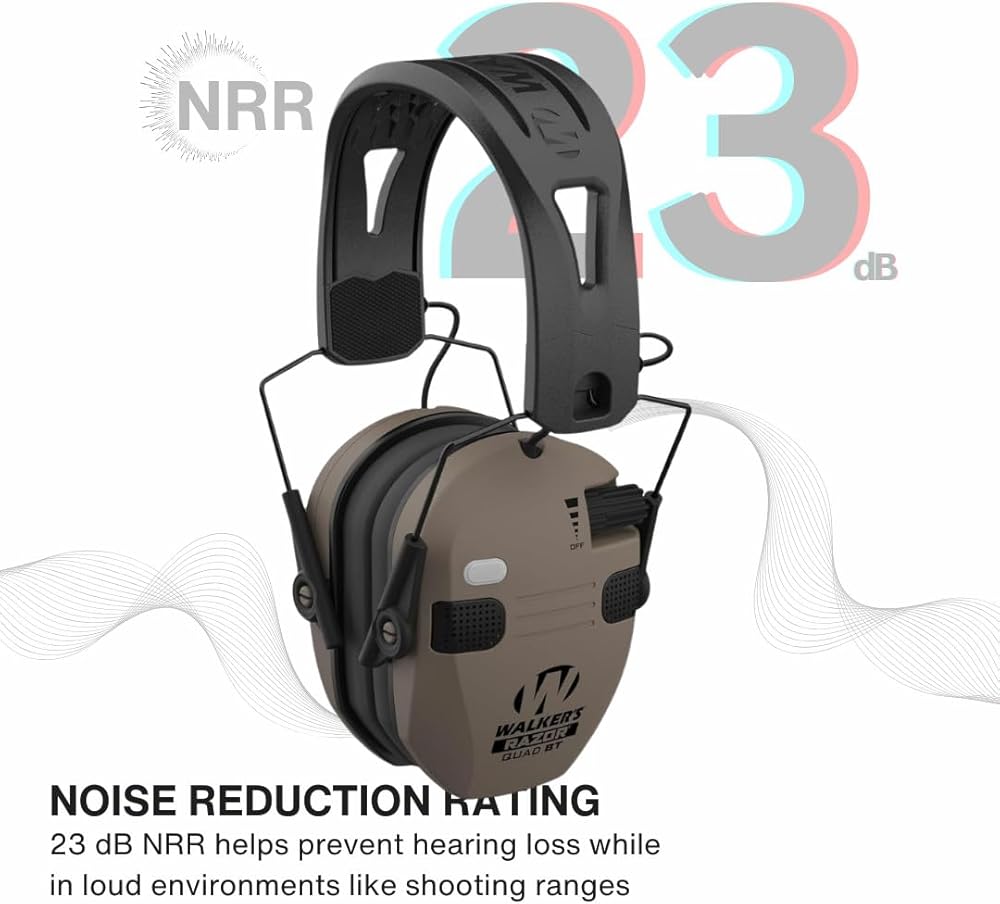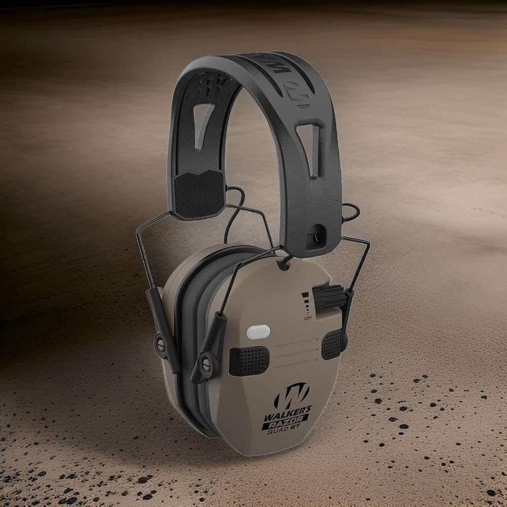 The Walker's Razor Slim Quad Electronic Earmuffs in Flat Dark Earth finish feature Bluetooth technology with volume control. This allows the shooter to control the volume of the ambient noise around them separately from the volume of their Bluetooth connected device. An integrated communication microphone allows for easy communication with others, while 4 hi-gain omnidirectional microphones pick up sounds 360 degrees around the shooter. A compact folding design and comfort headband with metal wire frame make the Razor Slim Electronic Quad Muffs some of the most advanced hearing protection on the market today.
