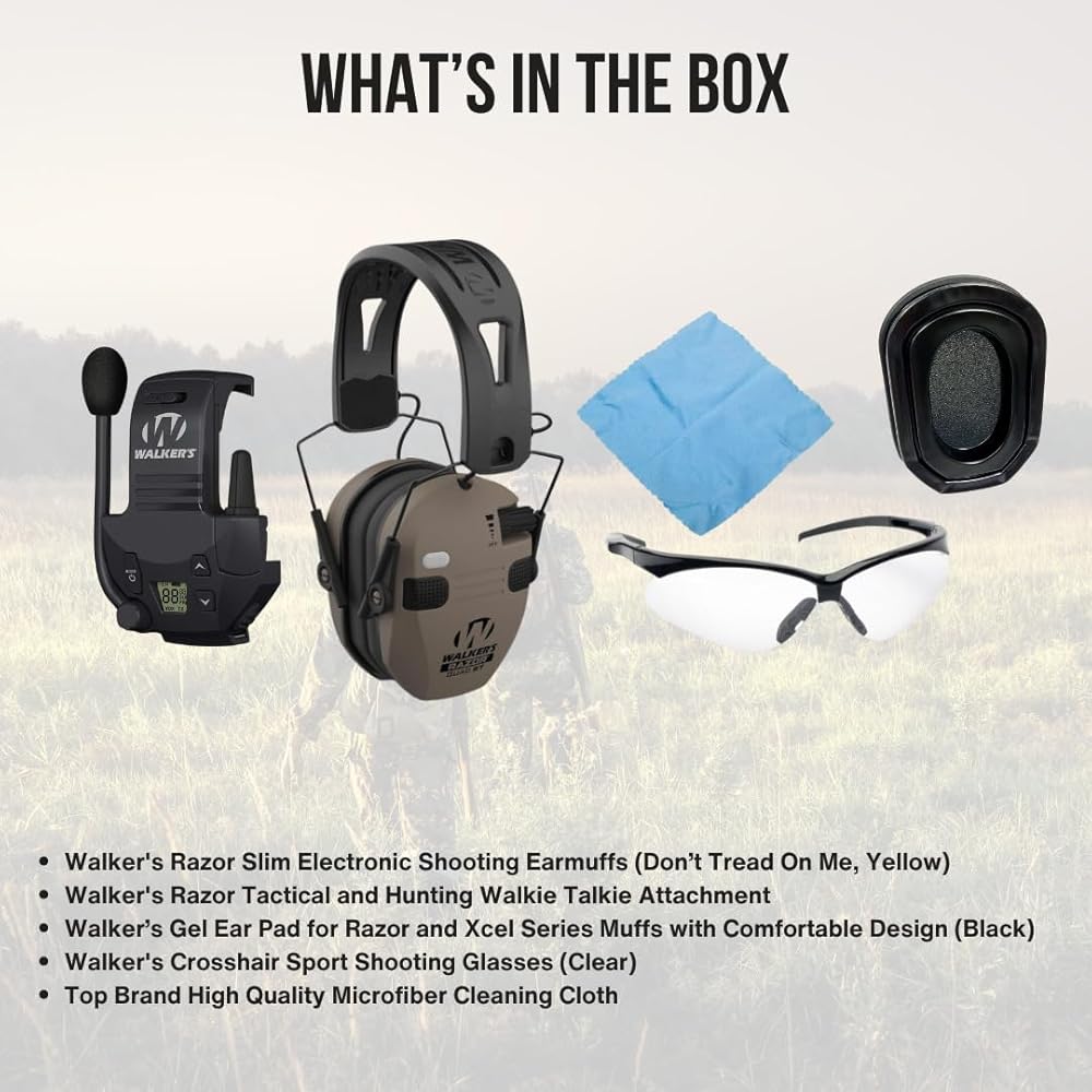 Bundle Includes: Walker's Razor Slim Quad Electronic Earmuffs with Bluetooth Technology (FDE), Walker's Razor Walkie Talkie Attachment, Walker's Gel Ear Pad (Black), Walker's Crosshair Sport Shooting Glasses (Clear), and Cleaning Cloth