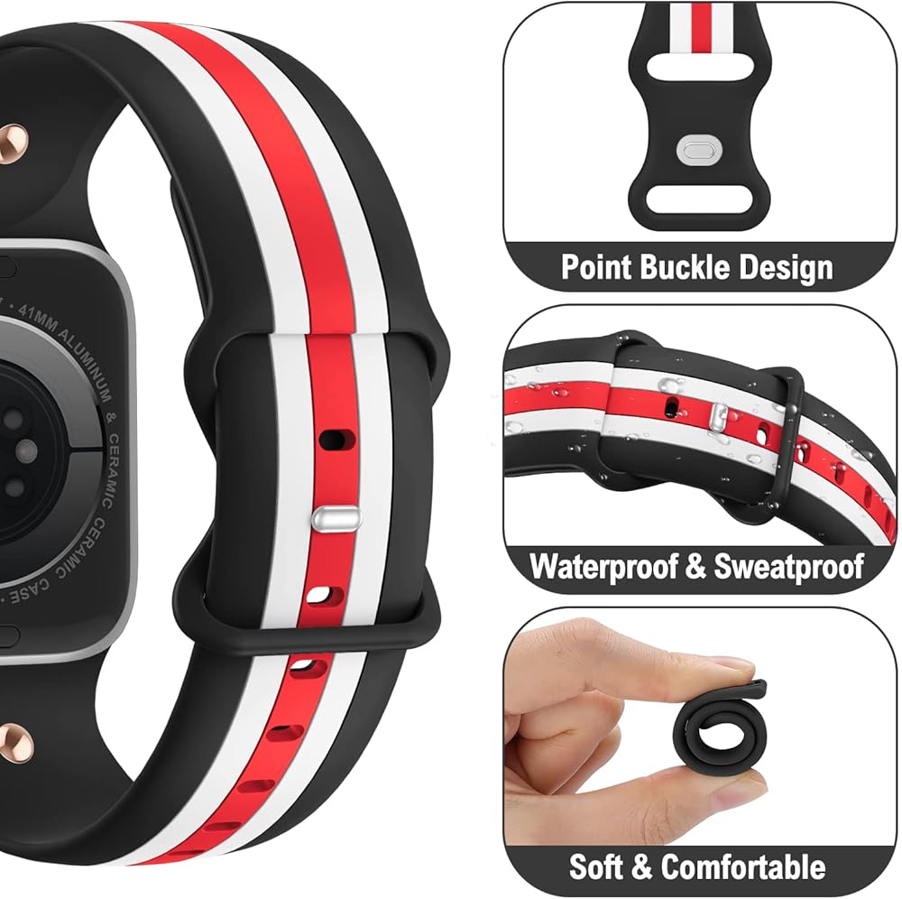 【مادة سيليكون ممتازة】 أحزمة ساعة التفاح الرياضية الخاصة بنا مصنوعة من السيليكون عالي الجودة، مرنة، مسامية، متينة، خفيفة الوزن، مقاومة للعرق، مقاومة للماء، تصميم إغلاق بدبوس وثنية، مناسبة للاستخدام اليومي للرجال والنساء.