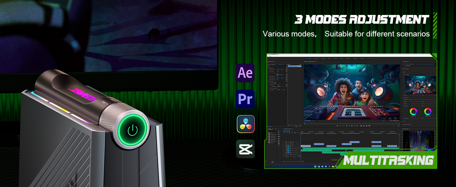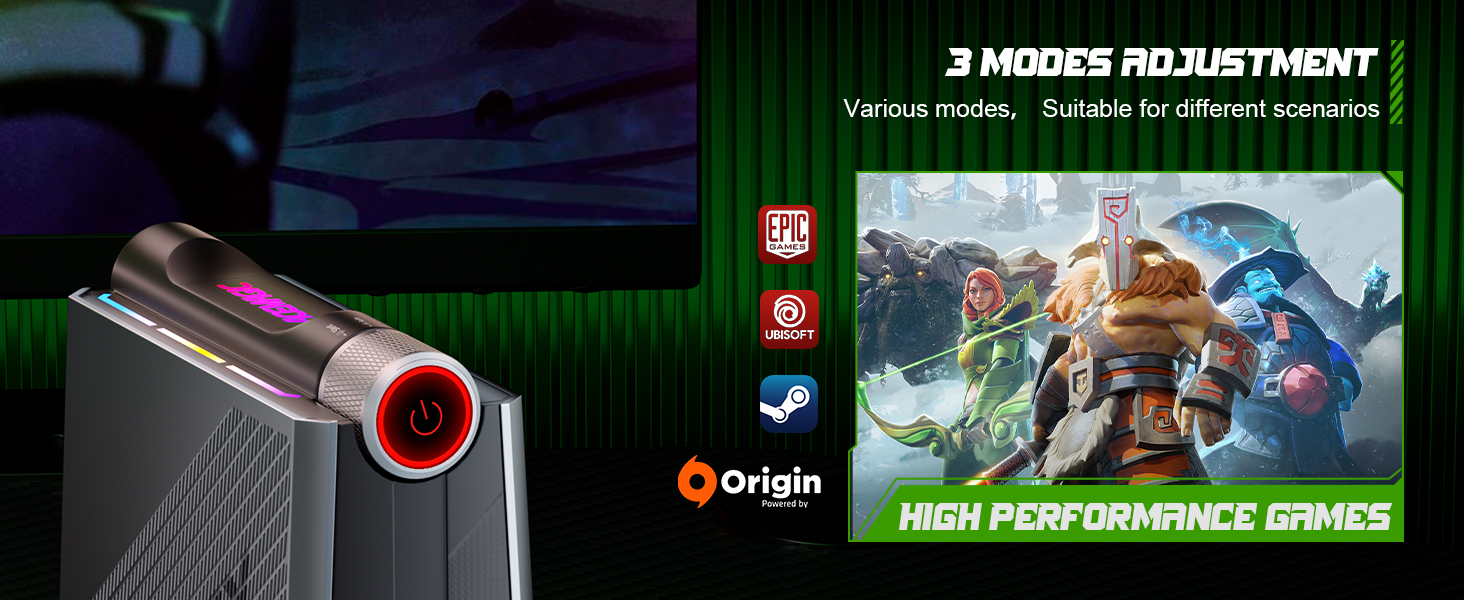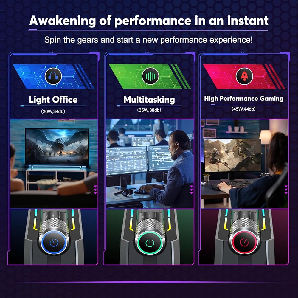 【𝟑 𝐏𝐞𝐫𝐬𝐨𝐧𝐚𝐥𝐢𝐳𝐞𝐝 𝐌𝐨𝐝𝐞𝐬 لتناسب احتياجاتك】اختر الألعاب المصغرة متعددة الأوضاع pc.①𝐒𝐢𝐥𝐞𝐧𝐭 𝐦𝐨𝐝𝐞، يتم تقليل قوة الكمبيوتر المكتبي الصغير إلى 25 وات، مما يجعل الصوت أقل بنسبة 20% من صوت المروحة الذي يبلغ 32 ديسيبل، ويساعدك على الاستمتاع بمكتب هادئ ومسرح منزلي بدقة 4K UHD. ②𝐀𝐮𝐭𝐨 𝐦𝐨𝐝𝐞، يعزز قوة الكمبيوتر الصغير إلى 35 وات لتحسين كفاءة عملك، مناسب للبرامج متعددة المهام أو المكاتب المكثفة المتوسطة إلى الراقية الطلب.③𝐏𝐞𝐫𝐟𝐨𝐫𝐦𝐚𝐧𝐜𝐞 𝐦𝐨𝐝𝐞، يعزز قوة الكمبيوتر الصغير حتى 45 واط ليكون صفة للمهام ذات المستوى الأعلى مثل الألعاب والبرمجة واسعة النطاق والعرض.