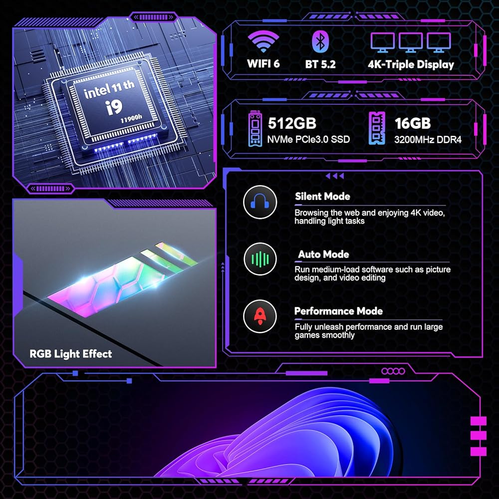كمبيوتر ألعاب صغير من ACEMAGIC i9، معالج i9-11900H (يصل إلى 4.9 جيجا هرتز)، كمبيوتر صغير للألعاب، ذاكرة وصول عشوائي 16 جيجابايت، 512 جيجابايت NVME SSD، كمبيوتر مكتبي صغير مع 3 أوضاع/RGB/مراوح مزدوجة/WiFi 6/BT5.2