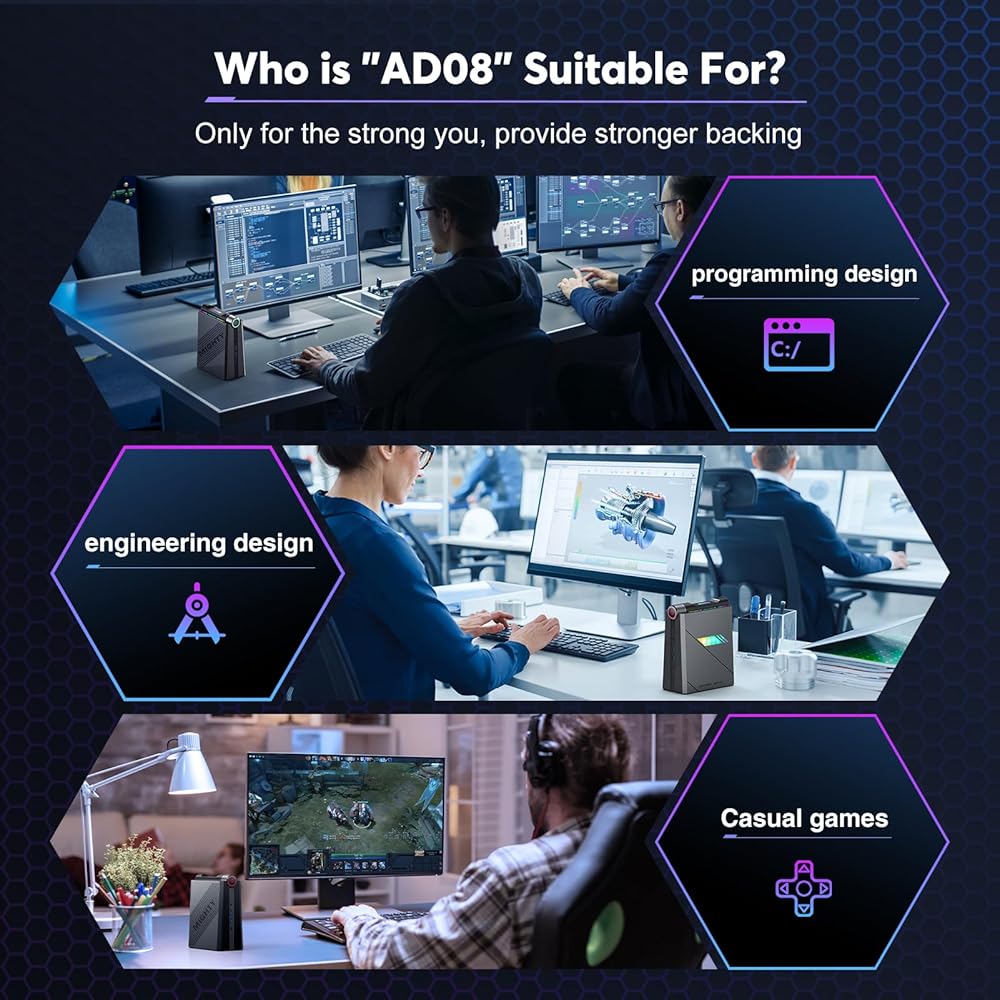 【شاشة عرض ثلاثية 4K】يأتي الكمبيوتر الصغير ACEMAGIC AD08 i9 مع وحدة معالجة الرسومات UHD، ويدعم شاشة عرض ثلاثية 4K HD(4096x2304)@60 جيجا هرتز (2* HDMI+1*Type-C). قم بتوصيل هذا الكمبيوتر الصغير بجهاز عرض كمسرح منزلي، واستمتع بمجموعة متنوعة من وسائل الترفيه. يعد جهاز الكمبيوتر الصغير i9 هذا بتجربة غير عادية للمكاتب الخفيفة أو حتى القدرات المكتبية المكثفة المتطورة، وأعمال عرض التصميم واسعة النطاق، وحتى الألعاب.