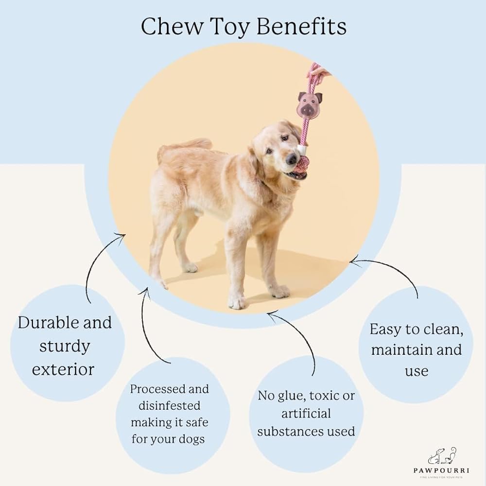 Keep your dogs constantly entertained with the perfect play partner, our Pawpourri Chew toys. Playtime is a core pillar for your pets overall health and wellness and our chew toys are ideal accessories for interactive play. They provide mental and physical stimulation, provide an enjoyable cognitive workout, and most of all, bring joy to both you and your pet. Signature Pawpourri Benefits with Chew Toys - Promotes dental health for your furry friends. - Designed to meet a variety of needs from boredom to relief - Soothing for young animals that are teething Best Fit For- This toy is perfect for medium to large dogs