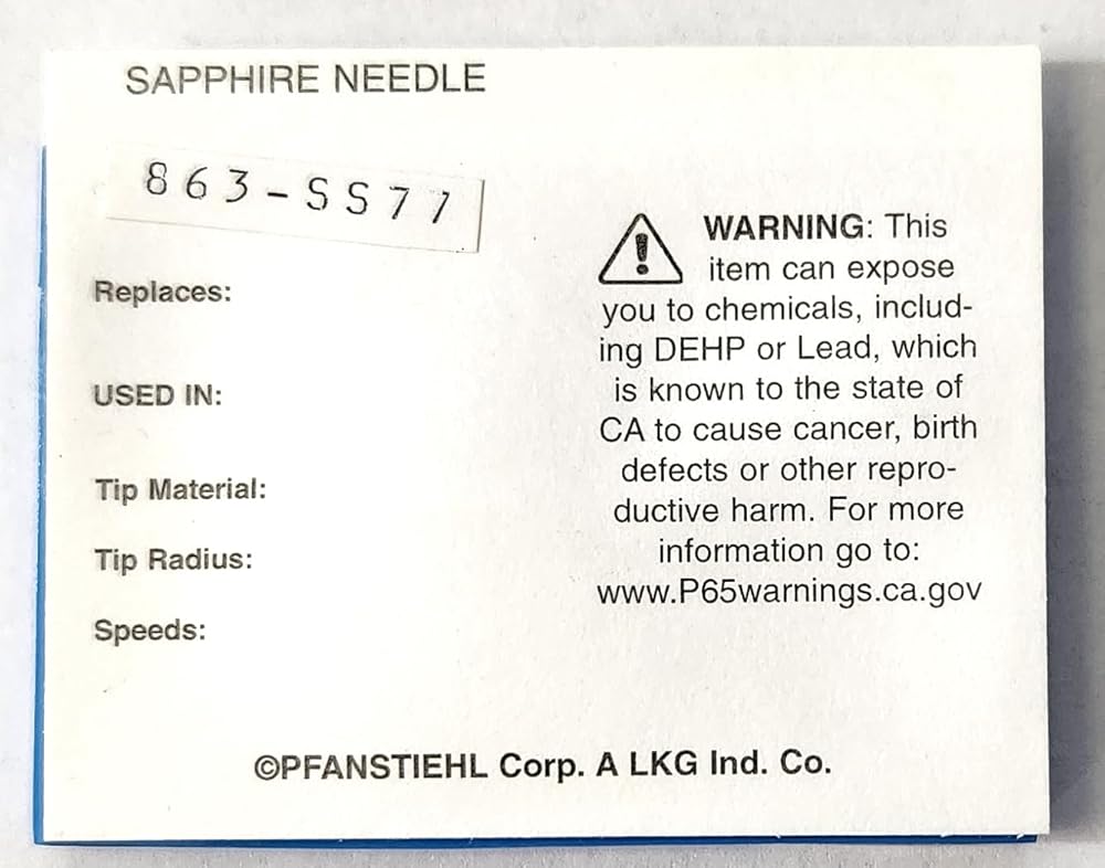 • Pfanstiehl 863-SS77 Stereo replacement needle for record players using Varco or Vaco cartridges.