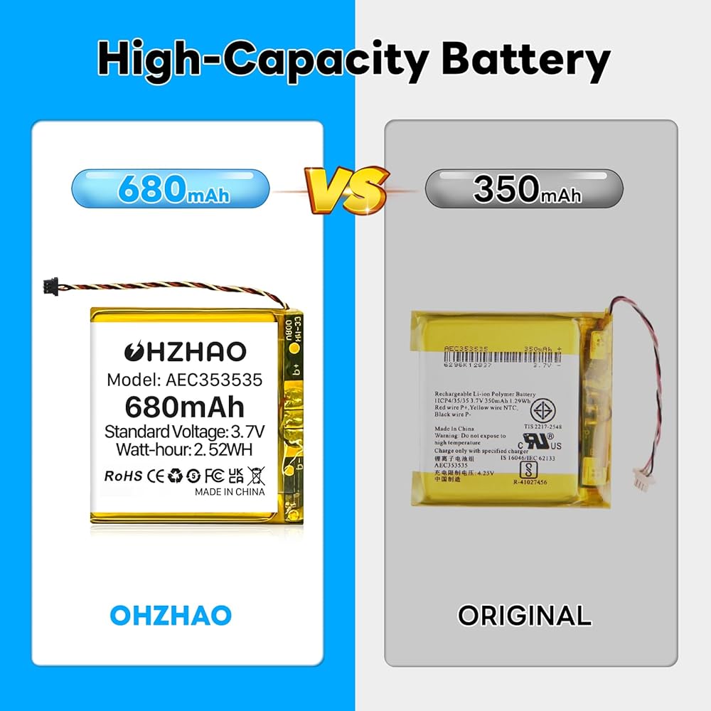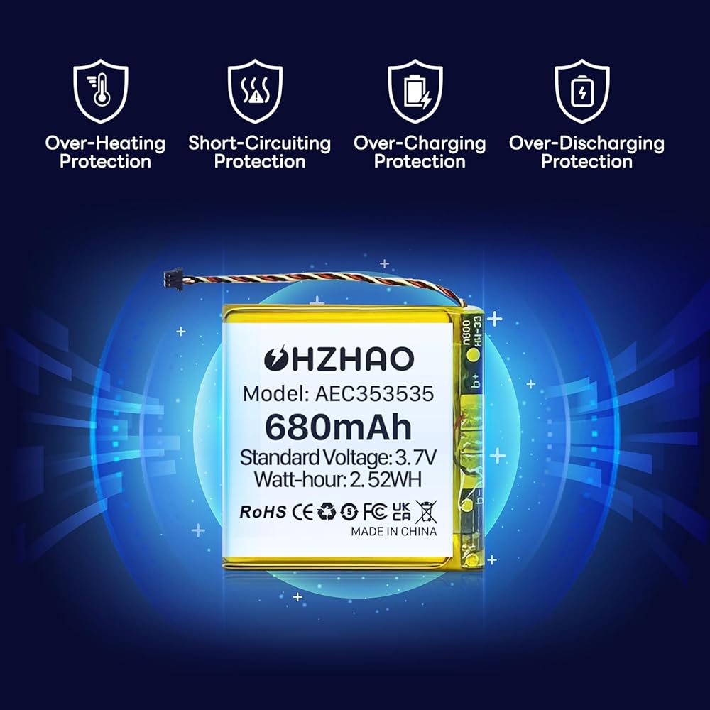• 【سعة عالية】 بطارية OHZHAO القابلة لإعادة الشحن ذات سعة عالية 680 مللي أمبير في الساعة. نوع البطارية ليثيوم أيون، الجهد الكهربي 3.7 فولت. قد يتم إرسال بطاريتنا بطاقة قليلة أو معدومة، يرجى شحنها بالكامل أولاً.