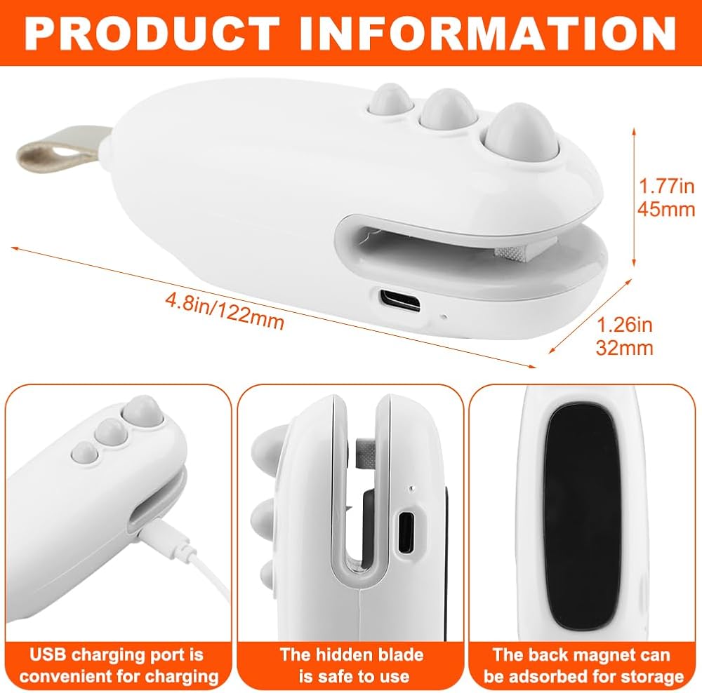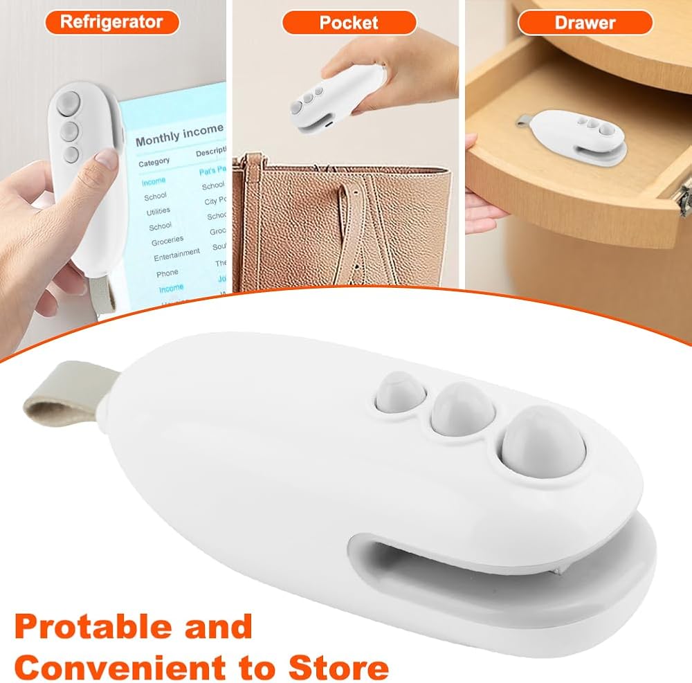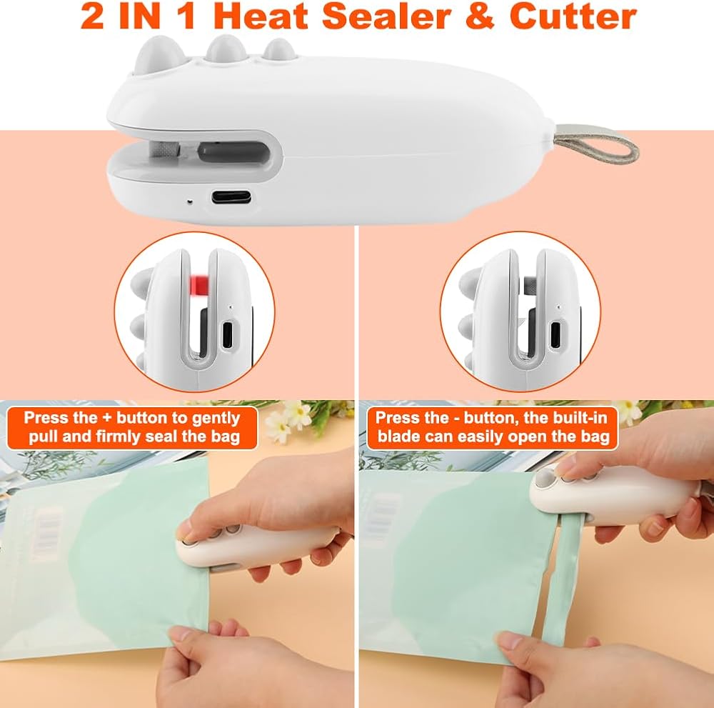 【BAG SEALER/OPENER】Dual-use mode. It can seal or open bags. Press the + button to gently pull and firmly seal the bag. Press the - button, the built-in blade can easily open the bag. (When pressing the blade, you need to control the force to avoid pressing too tightly and being unable to drag)