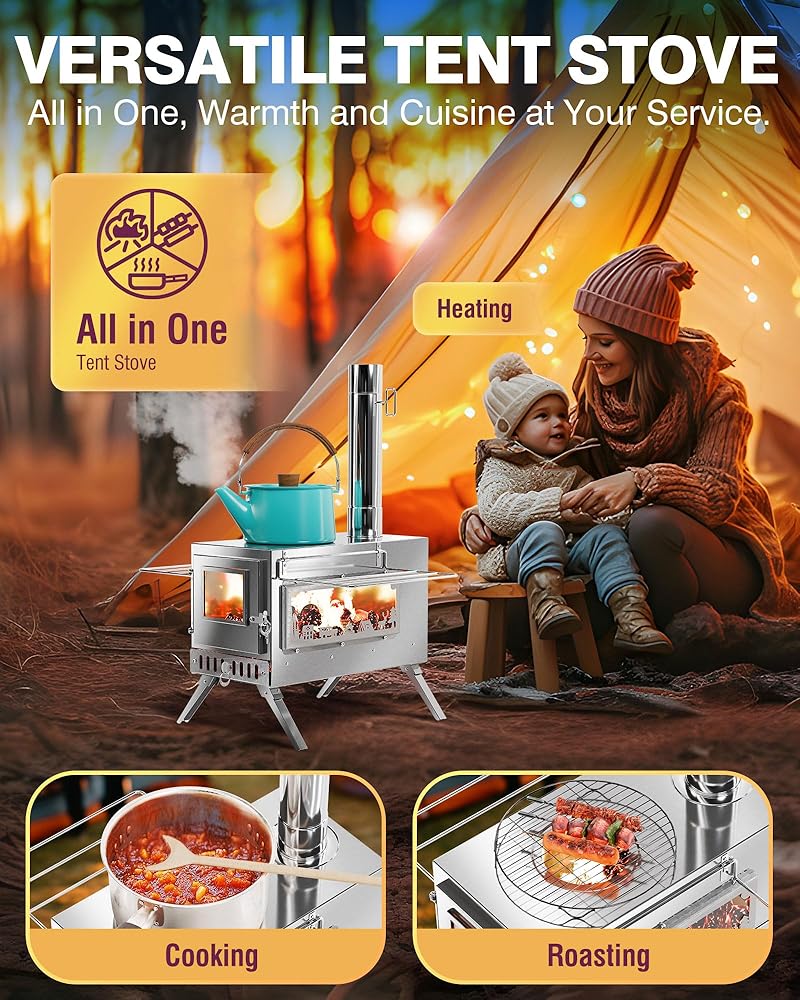 موقد خيمة - موقد حرق الخشب للتخييم، موقد خيمة ساخن محمول من الفولاذ المقاوم للصدأ مع 8 أنابيب مدخنة (5.9 قدم)، موقد خشبي للخيمة للطهي في الهواء الطلق، والتخييم، والمشي لمسافات طويلة، وصيد الأسماك على الجليد، والصيد