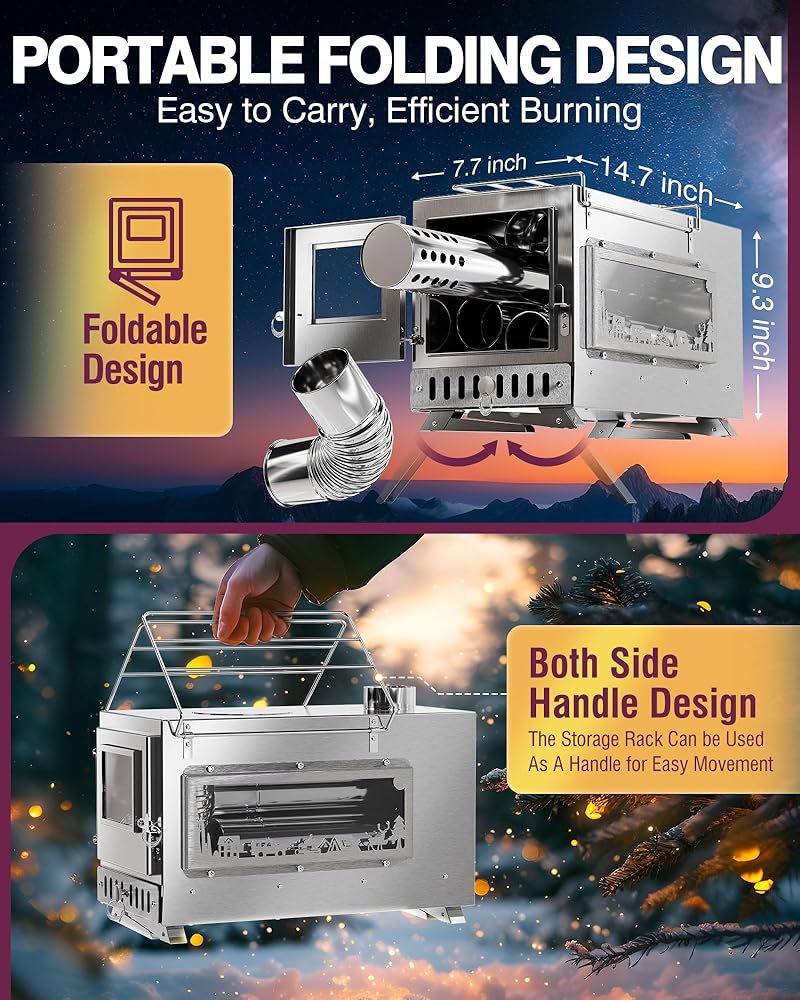 • تصميم مدمج ومحمول: يمكن طي موقد الخشب ذو الخيمة الساخنة حتى 14.7 بوصة × 7.7 بوصة × 9.3 بوصة/37.5 × 19.5 × 23.5 سم مع أنابيب مدخنة مخزنة بالداخل، وخفيفة الوزن (17.2 رطل)، ورفوف جانبية يمكن مضاعفة كمقابض لسهولة الاستخدام. يضمن التحكم في الهواء السفلي وصمام المدخنة القابل للتعديل احتراقًا فعالاً.