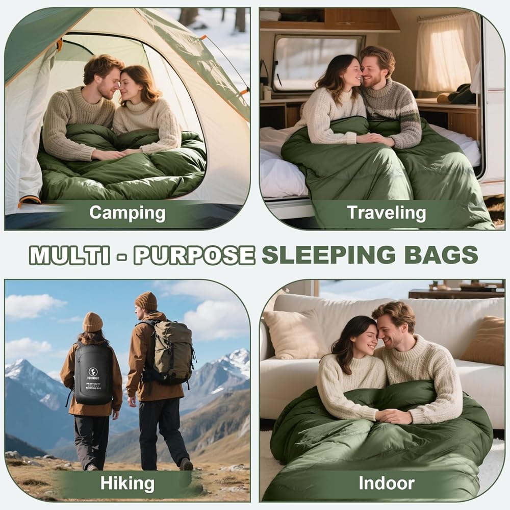 • مقاس الملكة - أوسع وأكثر سمكًا: مقاس كيس النوم المزدوج هذا هو: 90 بوصة × 59 بوصة (230 × 150 سم) ويزن 12 رطلًا/5.4 كجم واسعة ومريحة، مثالية للأزواج أو الأفراد الذين يبحثون عن مساحة إضافية للتمدد والاسترخاء. حقيبة النوم للبالغين هذه مصممة واسعة وسميكة، مما يجعلها خيارًا مثاليًا للتخييم في الخريف والشتاء