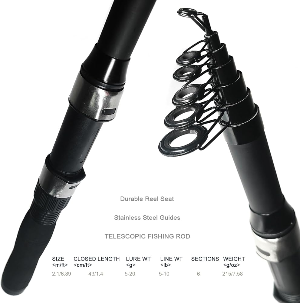2.1 m/6.89 ft Telescopic Fishing Rod: Each rod measures 2.1 m/6.9 ft constructed with high density carbon fiber material for amazing performance and durability. Telescopic and portable design allows it convenient to carry, east to travel.