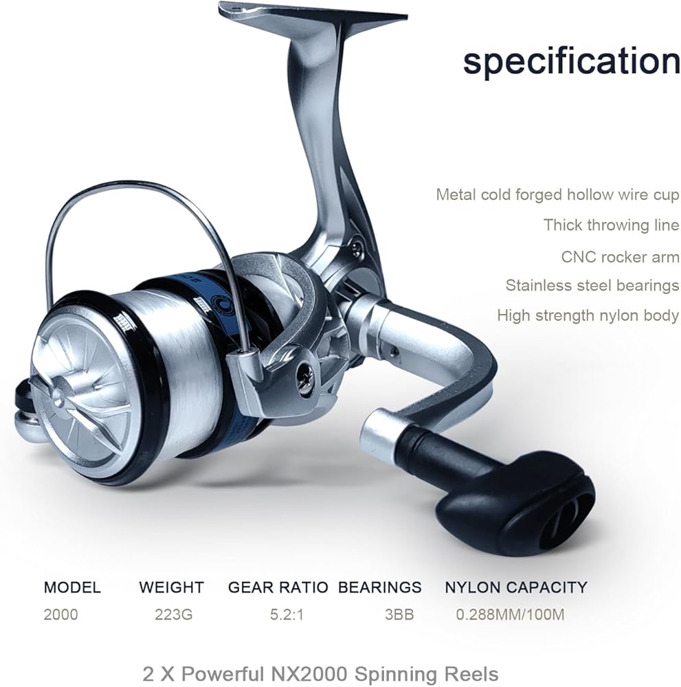 Spinning Fishing Reel: Size FF3000 Fishing Wheel with Left/Right interchangeable collapsible handle, aluminium spool, stainless steel silent ball bearings, 5.2:1 gear ratio. EVA handles are comfortable, durable and exceptionally slip resistant. Weight: 200g/7oz.