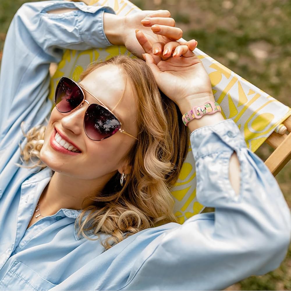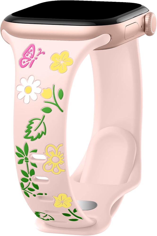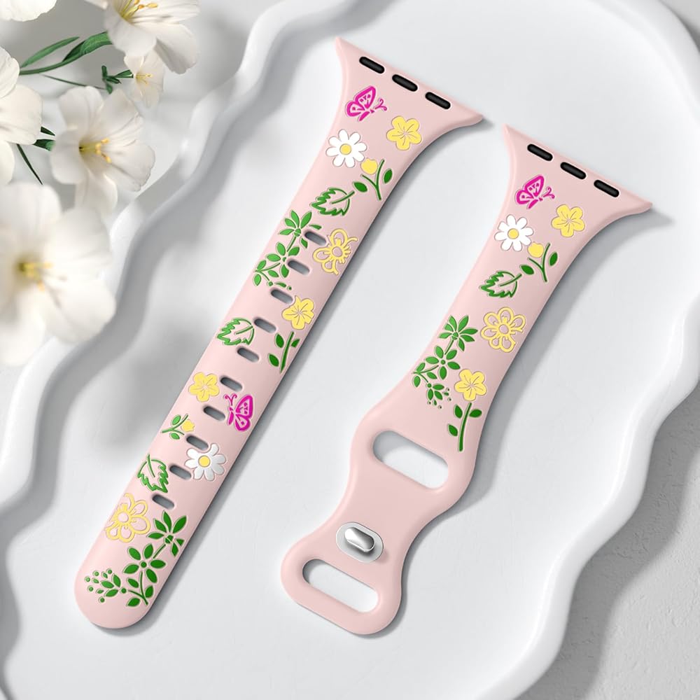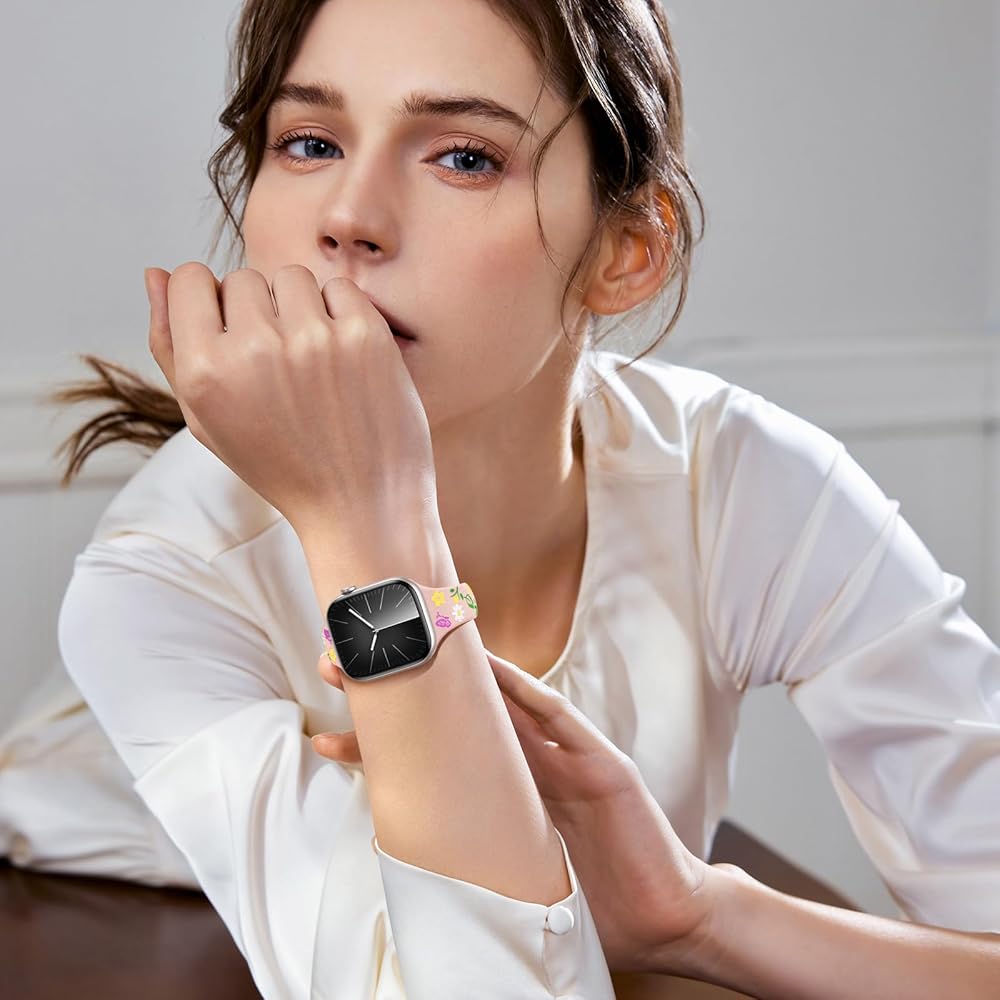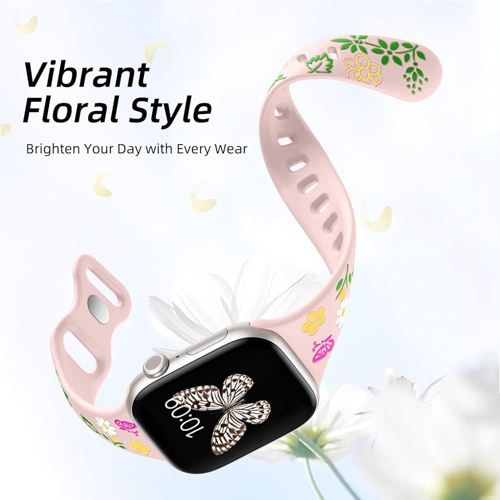 • أحدث طراز من الزهور المرصعة: يتميز سوار Apple Watch الأنيق للغاية والرفيع للنساء بعملية ترصيع متقدمة متعددة الألوان، حيث يقوم بتضمين الزهور والفراشات في السيليكون الناعم. تظل الأنماط النابضة بالحياة والواضحة مشرقة دون أن تبهت، مما يضيف جاذبية بصرية فريدة لساعتك